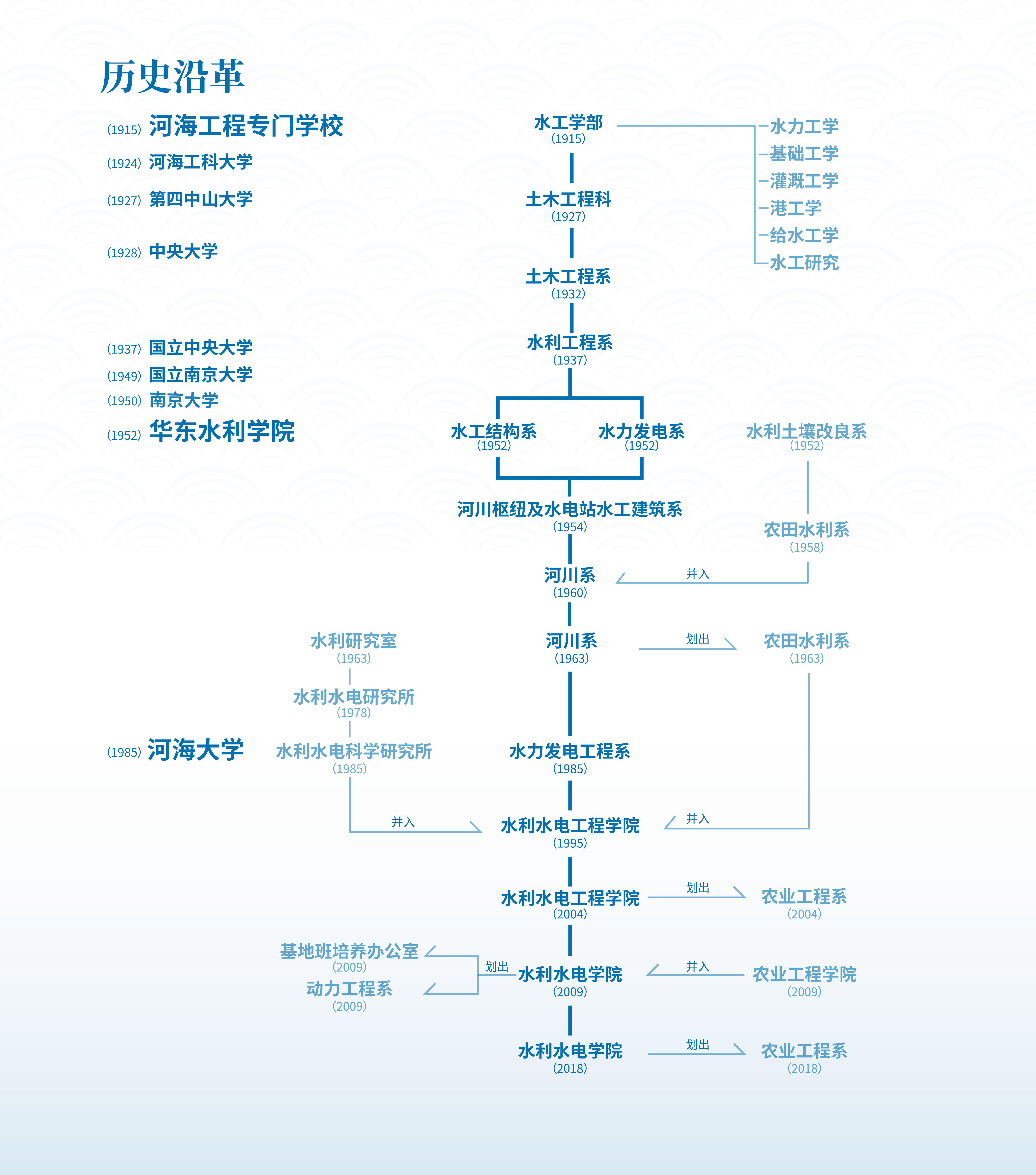 1915年,在“大工将施,储才为急”的时代背景下,河海工程专门学校创办时,便设立了水工学部核心教学单位,成为我国水利工程建设领域最早开展高等教育的组织。1952年,华东水利学院建立时,赓续传统创设了水力发电系和水工结构系,矢志为迫切的新中国水利事业培养专门建设人才。1954年,水力发电系和水工结构系合并为河川枢纽及水电站水工建筑系,1984年河川系改名为水力发电工程系。建系之初,聚集了一批具有真才实学的名师大家和骨干力量,他们亲自动手制订水工专业教学计划与培养方案,编写讲义和教材,形成了完整的皇冠赌场 工程专业人才培养体系,着力培养一大批掌握高级工程技术,规划、设计、建造、管理的水利专门人才。七十年来,水电人遍布祖国的江河湖海,哪里有困难,哪里就有水电人的身影;哪里有需要,哪里就有水电人的步伐。