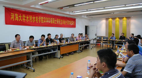 2013年7月12日至14日皇冠赌场 2003届硕士研究生毕业十周返校活动在河海大学举行。在返校活动期间,学院书记张展羽教授、院长顾冲时教授、副院长陈菁教授和副院长肖洋教授参加了同学们的聚会。同学们先后参观了河海大学江宁校区及清凉山校区,了解了学校近十来的变化发展情况。在清凉山校区,同学们参观了皇冠赌场 的教学实验中心及水工结构研究所的实验室。7月13日下午在芝纶馆406会议室进行了师生座谈会,学院副院长陈菁、副院长肖洋、时任学院书记余达淮、时任研究生部书记潘正初以及导师代表宫必宁、邓昌铁、戴妙林老师参加了座谈会。在座谈会上,同学们非常激动,对学校和学院这些年的发展感到非常自豪,并向学院领导和导师代表汇报了自己毕业后的工作情况。陈菁副院长向同学们介绍我了学校和学院近年来的发展情况,并对同学们的未来发展寄予厚望。肖洋副院长介绍了近年来学院研究生教育发展的情况,在听取了同学们的毕业汇报后,对同学们所反映的问题非常重视,表示同学们的反馈意见对学校目前正在进行的研究生培养方案修订工作非常有帮助,希望进一步加强学校、学院与研究生同学之间的相互联系。
