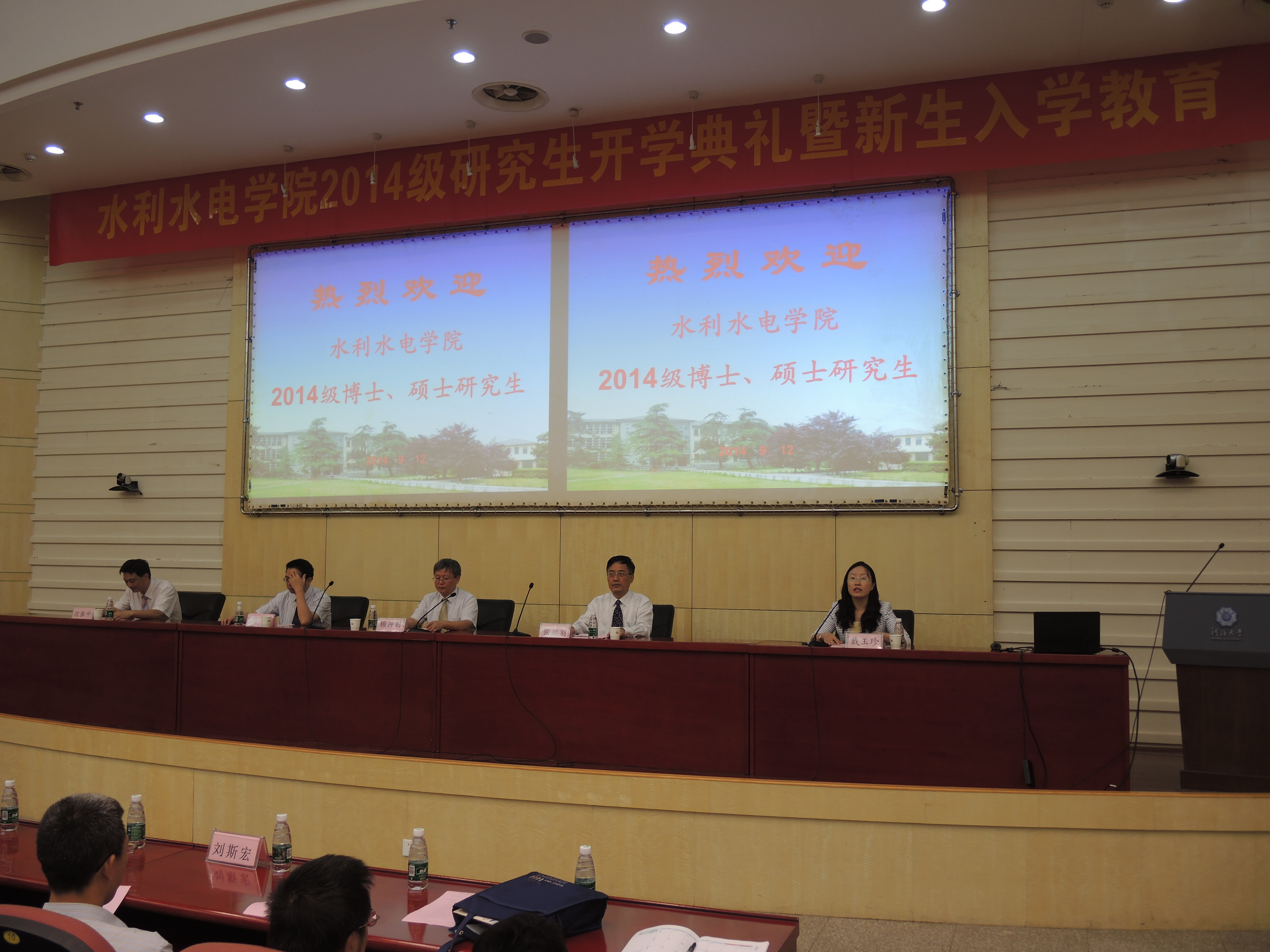 2014年9月12日上午8:30,皇冠赌场 在闻天馆108隆重举行2014级博士、硕士研究生开学典礼暨新生入学教育。皇冠赌场 院长顾冲时教授,党委书记张展羽教授,副院长肖洋教授、沈振中教授,及皇冠赌场 工程系主任蔡付林教授,农业水利工程系主任朱成立副教授,水工结构研究所副所长苏怀智教授,水电研究所副所长周建旭教授,水力学及河流动力学研究所副所长杨校礼老师,农业水土工程研究所所长郭相平教授,农业环境研究所所长邵孝侯教授等出席了典礼,典礼由皇冠赌场 党委副书记戴玉珍老师主持。参加典礼的还有皇冠赌场 研究生教学秘书周昶老师、研究生辅导员赵志涵老师以及辅导员助管慕子煜老师。