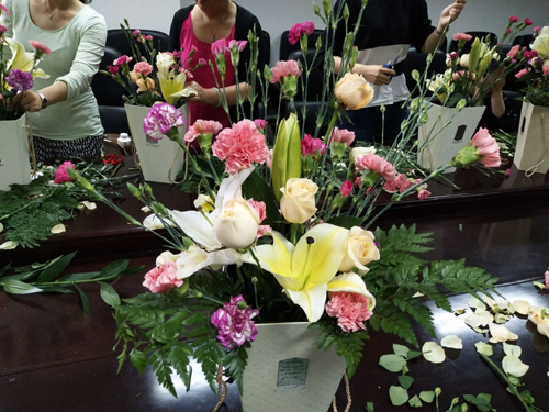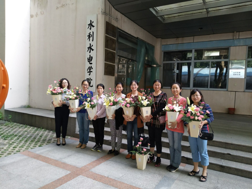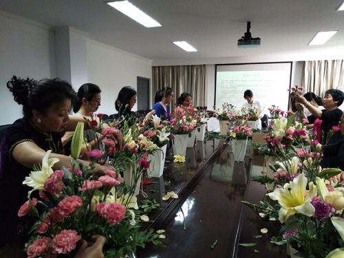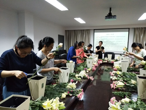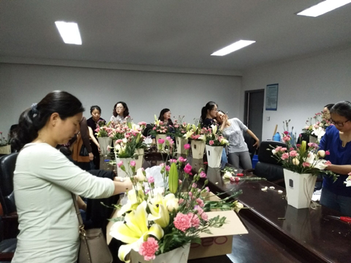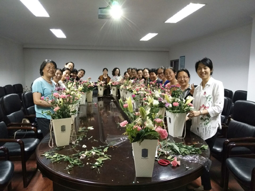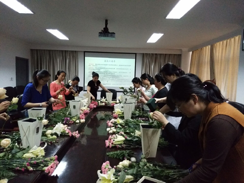 2017年5月12日学院的女教工们在水电馆420会议室自己给自己准备母亲节礼物,胡瑞媛老师请来园艺老师李海兰系统的给大家讲了插花技艺及要点,大家听得认真,学得开心,老师讲完,大家就开始了自己的插花,动手积极,其间还和老师互动,问这问那,通过自己的视觉美,展示刚刚学到的技艺,最后还开心的抱着自己的作品合影留念。(陶艳芝)