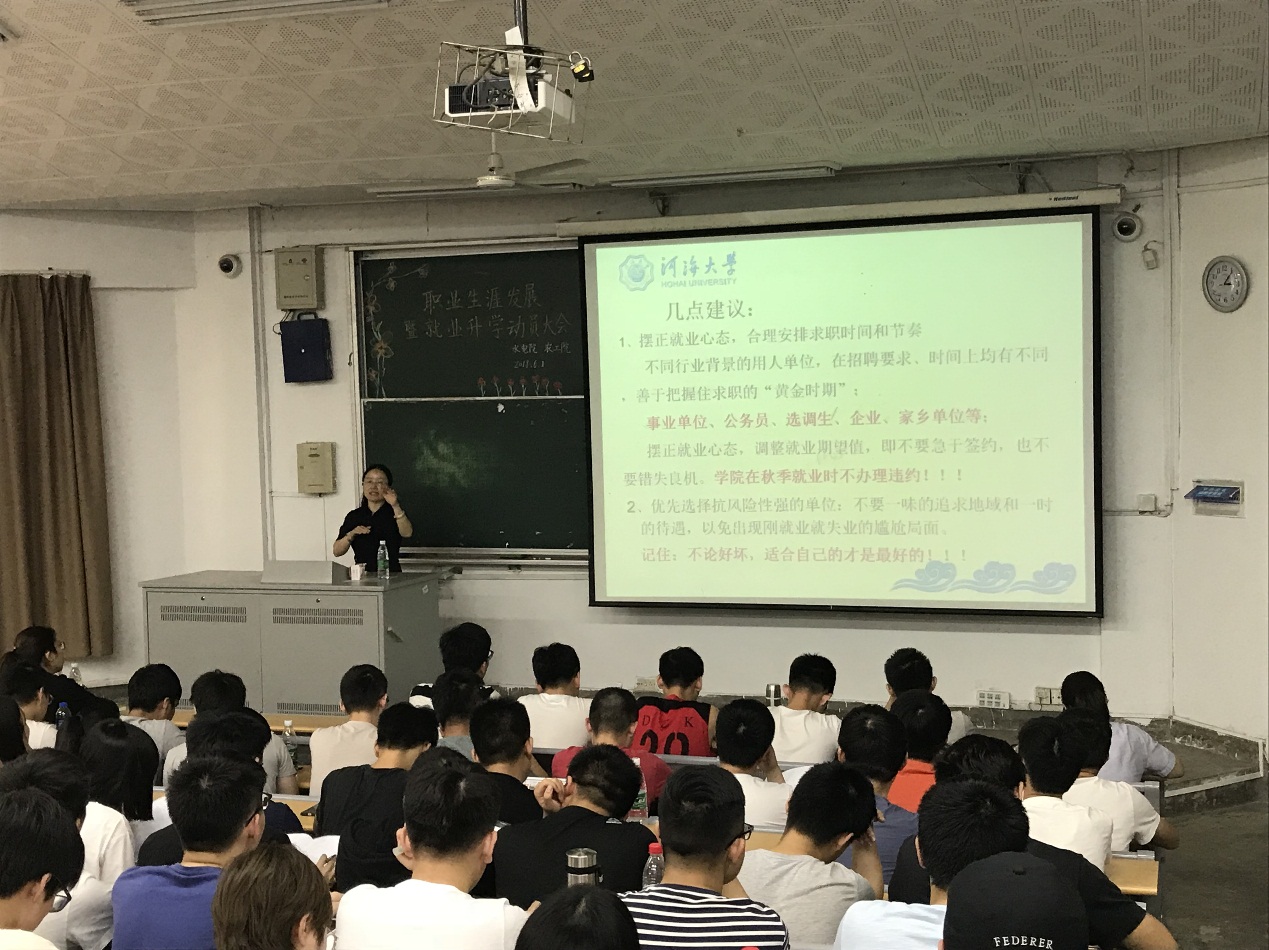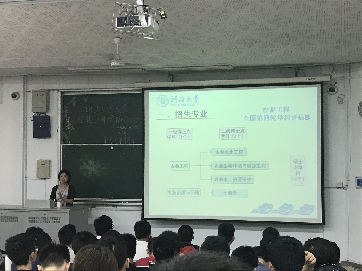 6月1日,水电院、农工院2015级全体同学于科学会堂101召开职业生涯发展暨就业升学动员大会。水电院方国华副院长、农工院陈菁副院长、水电院戴玉珍副书记为同学们做了就业与升学的讲座。