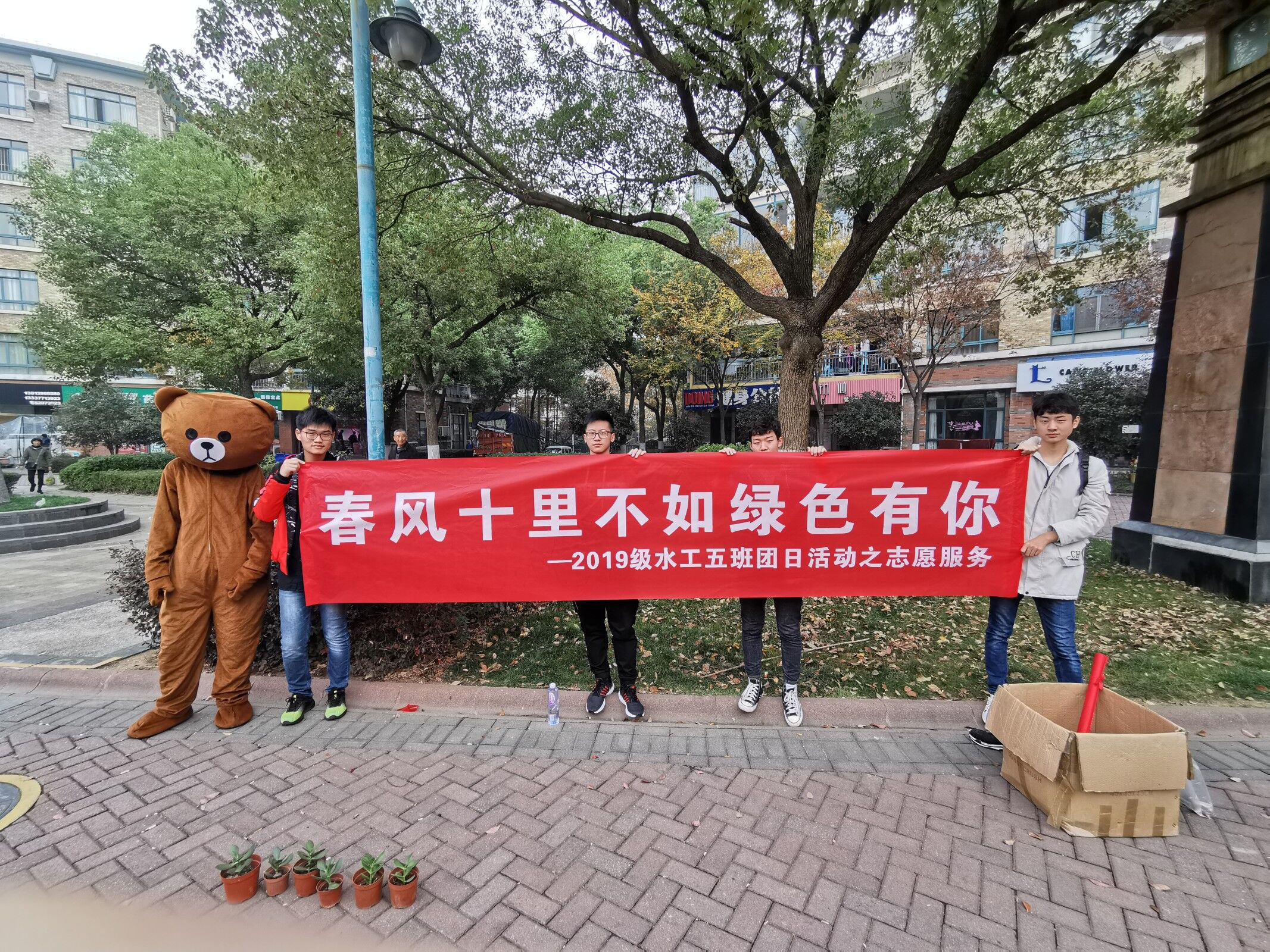为了鼓励群众养成绿色低碳生活的习惯,感受大自然中绿色的美丽,每天拥有绿色好心情。11月25日下午2:00,在2019级水工5班班长宋楠的带领下,班级同学们前往翠屏国际城小区开展团日活动之“春风十里不如绿色有你”绿植领养活动。