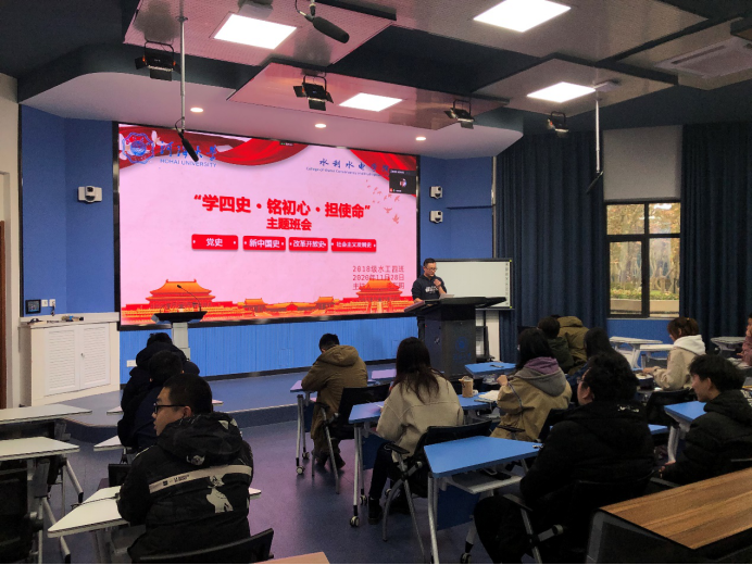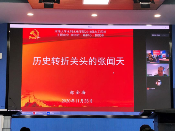 11月28日下午,水电学院2018级水工四班召开“学四史·铭初心·担使命”的主题班会。班会以线上线下相结合的形式召开,河海大学副校长郑金海在线出席班会。2018级水工四班全体同学参加班会。2018级水工四班班长李东明主持班会。