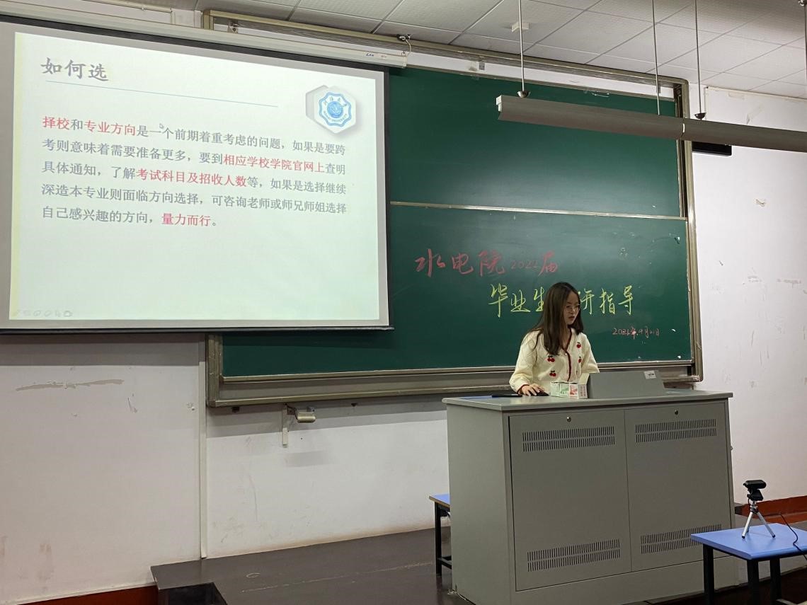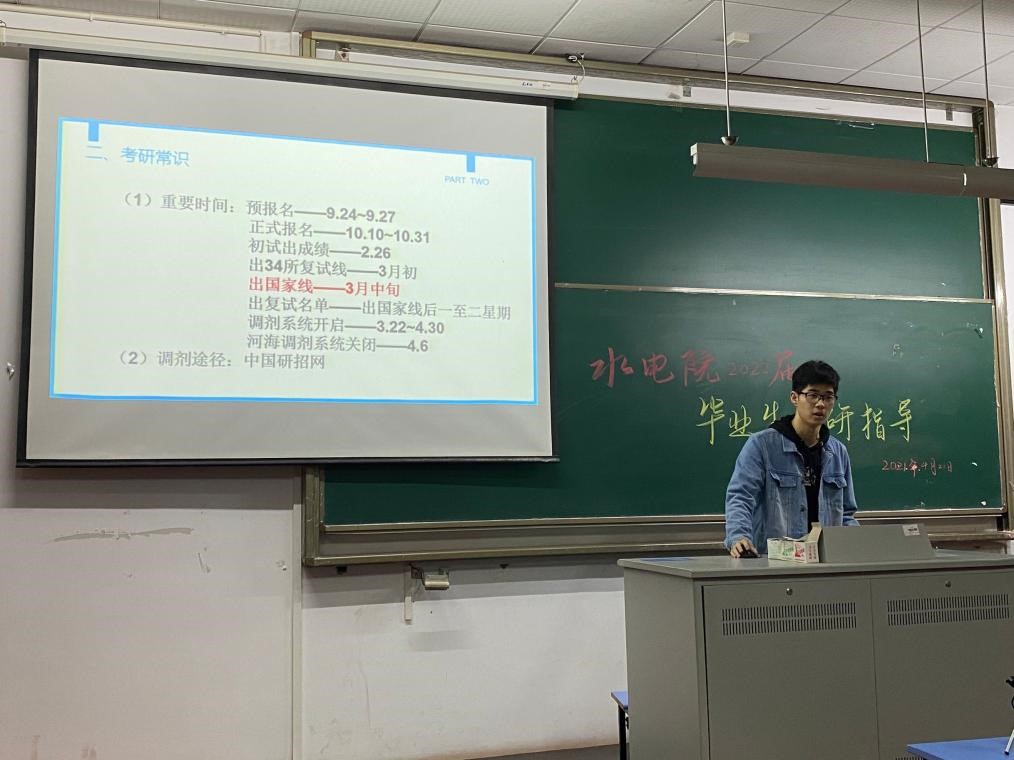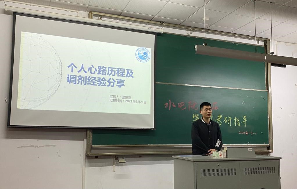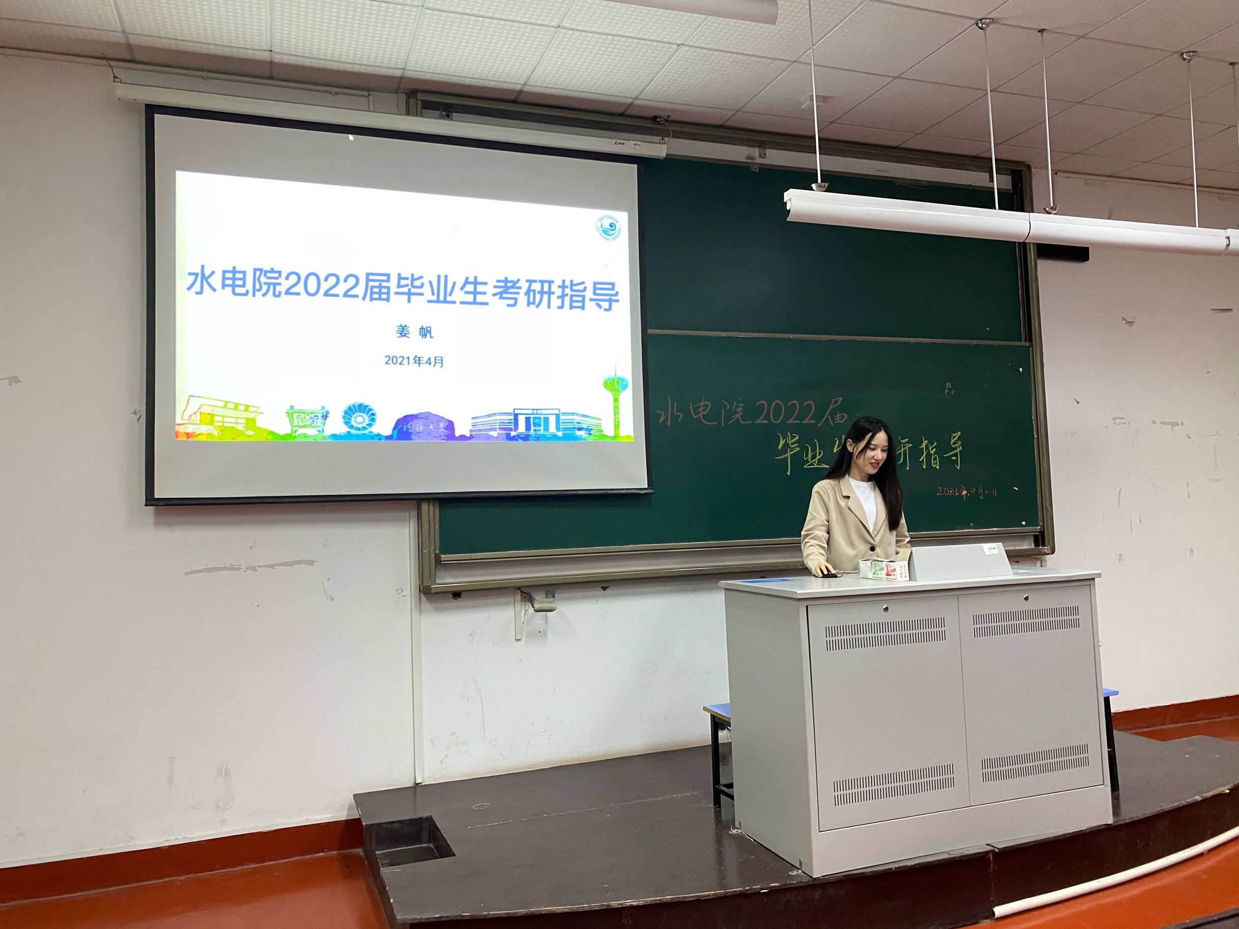 4月21日晚,皇冠赌场 召开水电院2022届毕业生考研指导会,会议由水电院2018级本科生辅导员姜帆老师主持,2017级本科生刘雪娇、李新、温家宣和张树立分享,水电院2018级全体本科生参会,学生家长在线上会议同步参与。