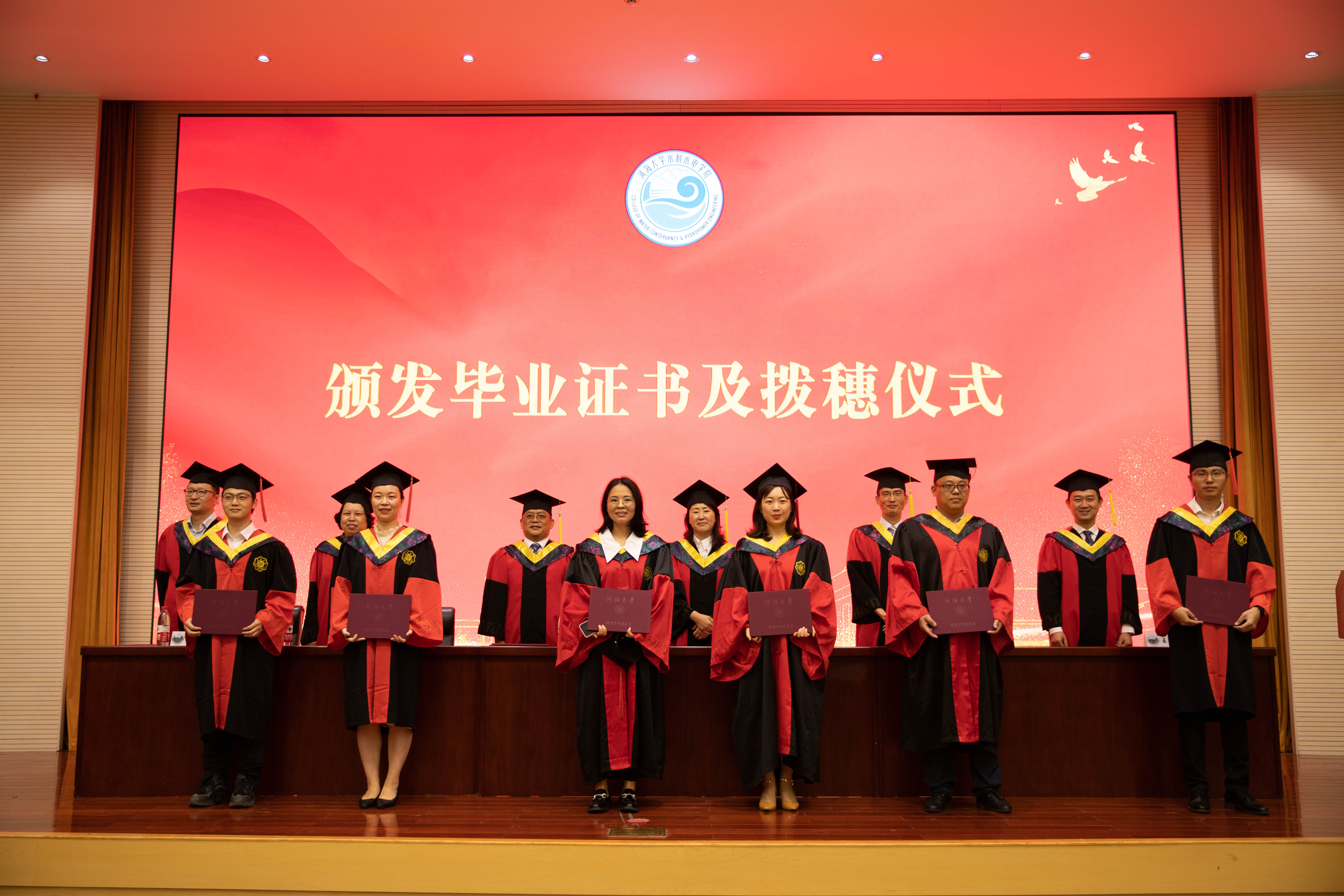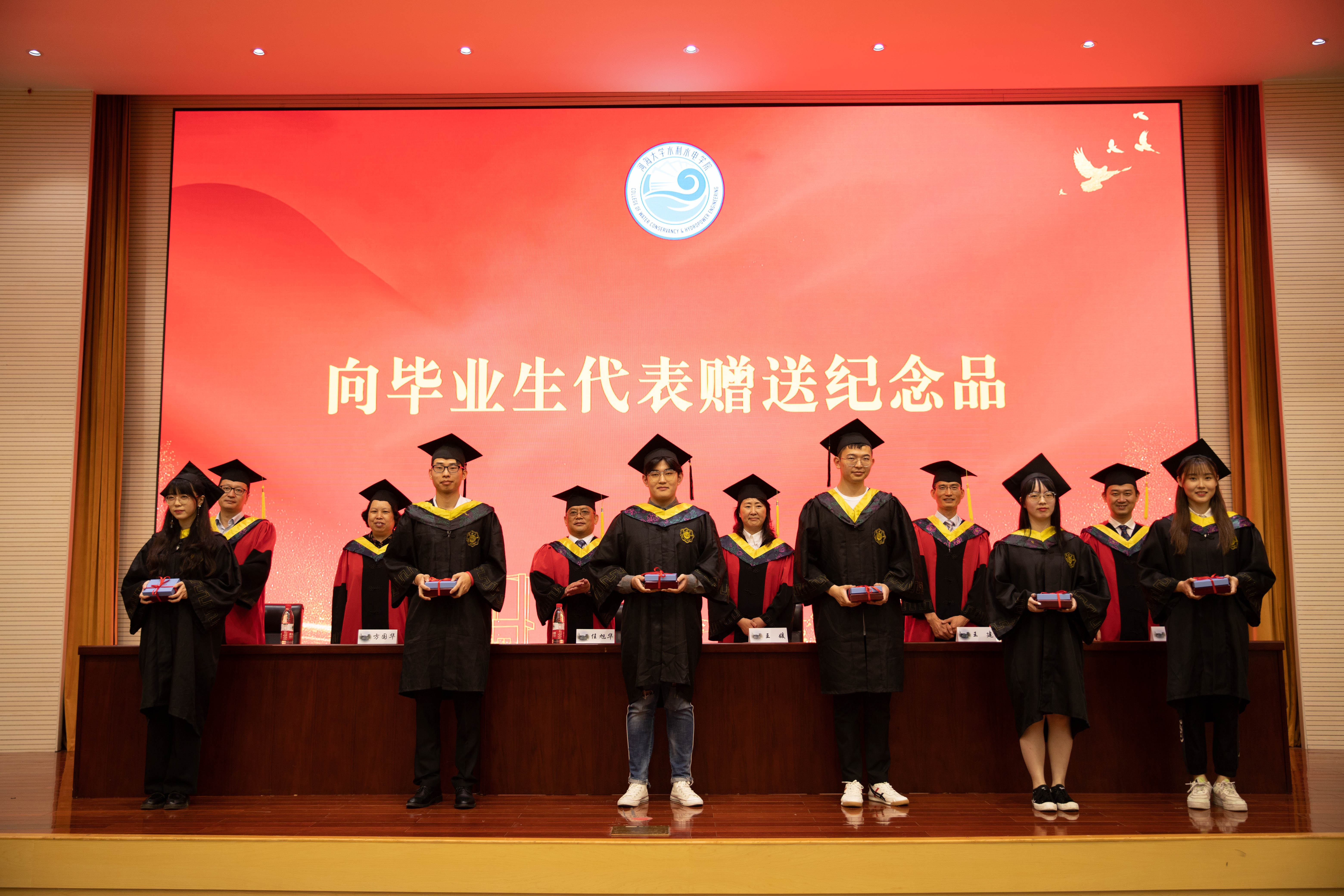 毕业典礼上,学院领导班子全体成员为毕业生颁发毕业证书,扶正流苏并合影留念。院党委书记任旭华院长王媛副院长方国华校友联络员颁发聘书领导班子向毕业生赠送校名、院名纪念品。