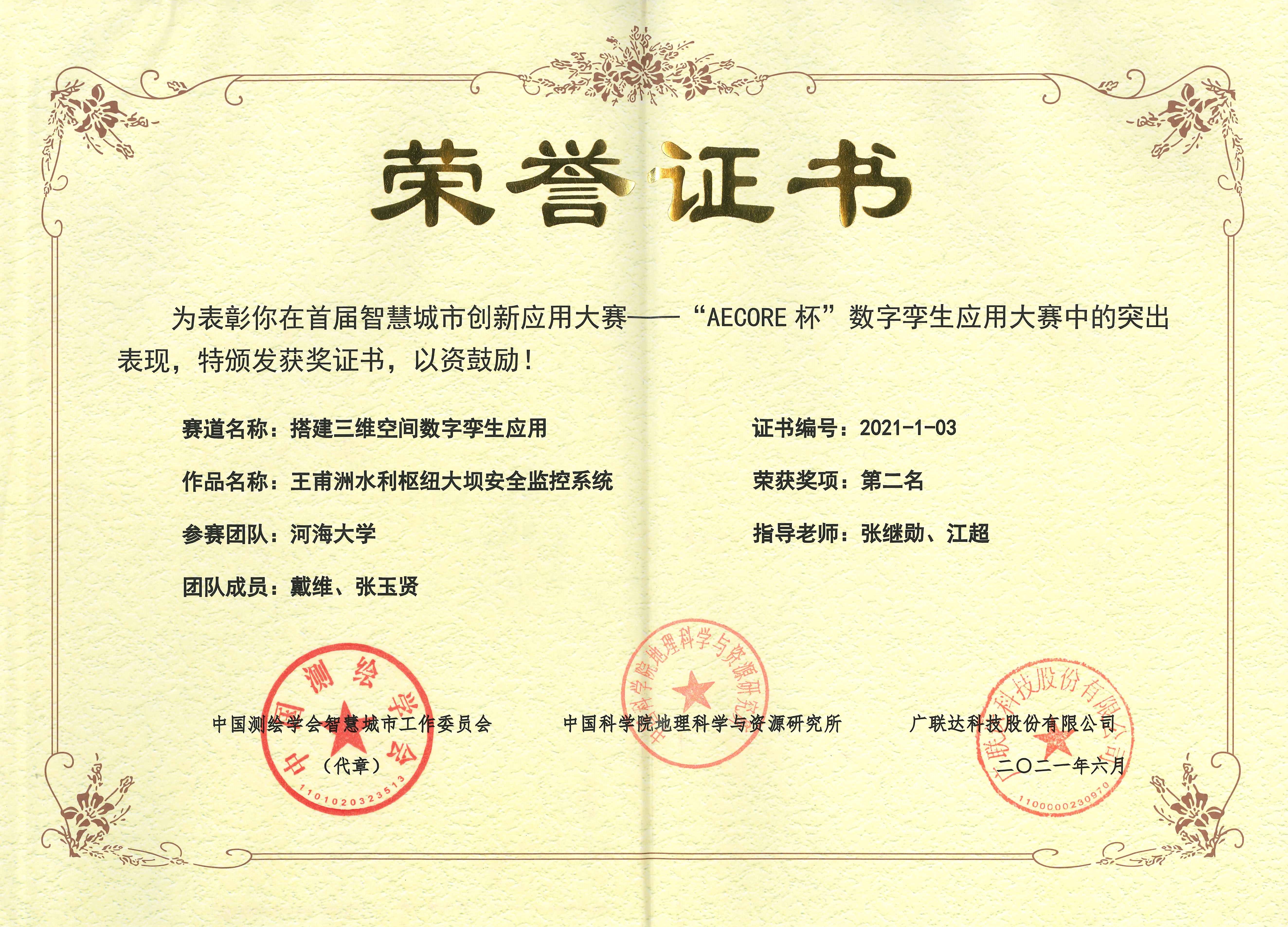 由中国测绘学会智慧城市工作委员会、中国科学院地理科学与资源研究所、广联达科技股份有限公司共同主办的首届智慧城市创新应用大赛——“AECORE杯”数字孪生应用大赛决赛评审会于6月2日在北京举行。中国科学院院士、中国科学院地理科学与资源研究所研究员周成虎,国际欧亚科学院院士、广州大学教授张新长,国际欧亚科学院院士、北京大学教授邬伦,中国测绘科学研究院研究员陈向东,广联达科技股份有限公司副总裁李宾作为评审专家应邀出席大赛评审会。大赛共收到了清华大学、北京建筑大学、河海大学、上海交通大学、雄安市民服务中心、浙江浙大中控信息技术有限公司等高校和企业的60余支队伍提交的作品。皇冠赌场 硕士研究生戴维、张玉贤组成的SimpleDam团队提交的作品“王甫洲水利枢纽大坝安全监控系统”最终荣获第二名的好成绩。