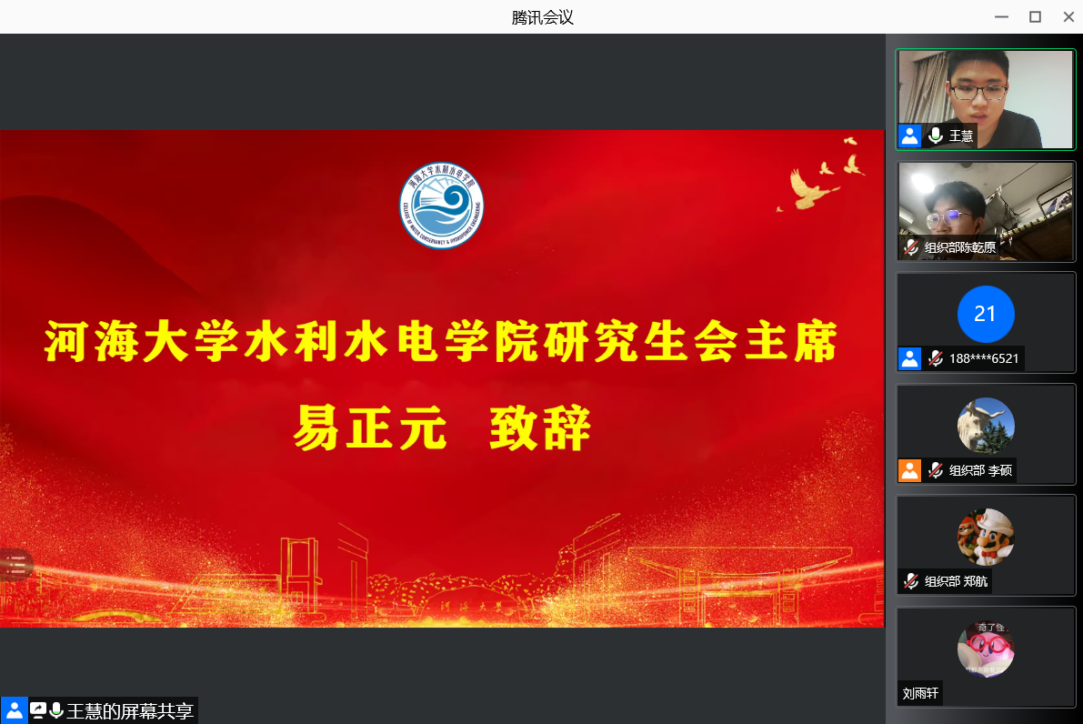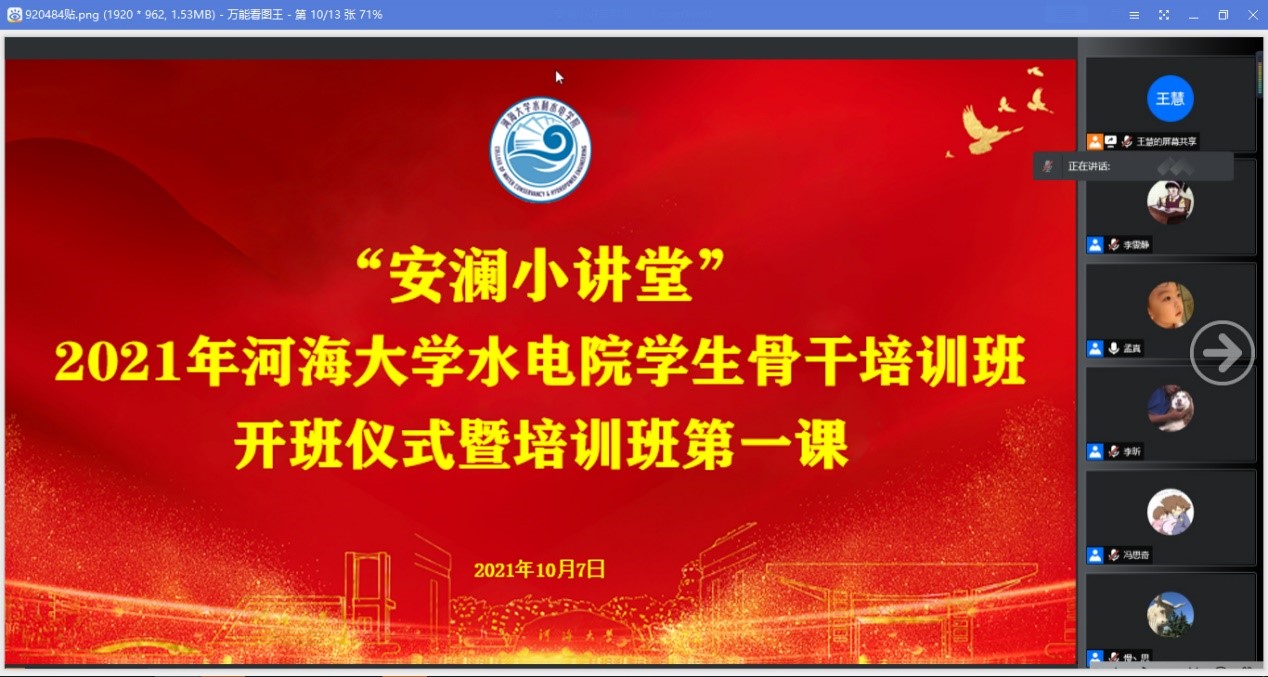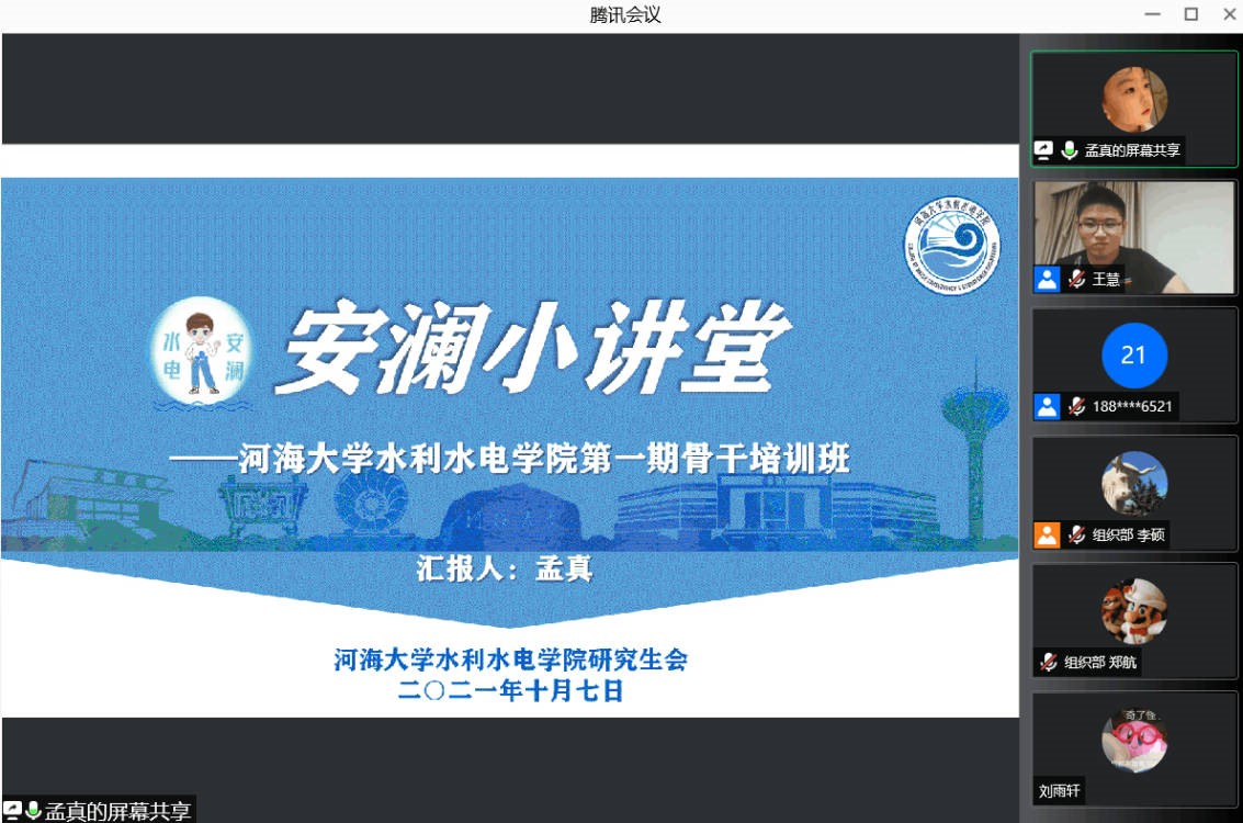 10月7日,“安澜小讲堂”——2021年河海大学水电院学生骨干培训班开班仪式暨培训班第一课在线上召开。河海大学研究生会主席团成员金子又、河海大学水电院研究生会主席易正元、副主席高阳、冯思奇及部长团成员出席本次培训,水电院第十九届研究生会全体成员及第二十四届学生会部分成员参与本次活动,活动由秘书处王慧主持。