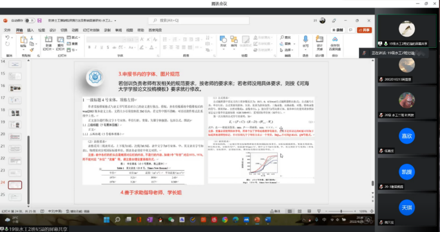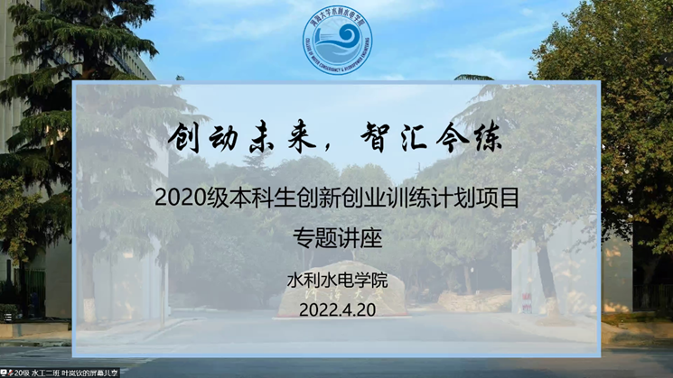 2022年4月22日,为更好帮助本科生了解大学生创新创业训练计划,营造学院浓郁科创学术氛围,皇冠赌场 举办2020级本科生创新创业训练计划项目专题讲座,邀请河海大学工程训练中心主任娄保东教授主讲, 学院2019级国家级、省级创训团队负责人纪溢、袁志鹏、刘俊明三位同学分享大创经验。学院副院长王建、党委副书记王方、2020级本科生辅导员笪步源及2020级大创团队成员参加,会议通过腾讯会议形式线上开展。