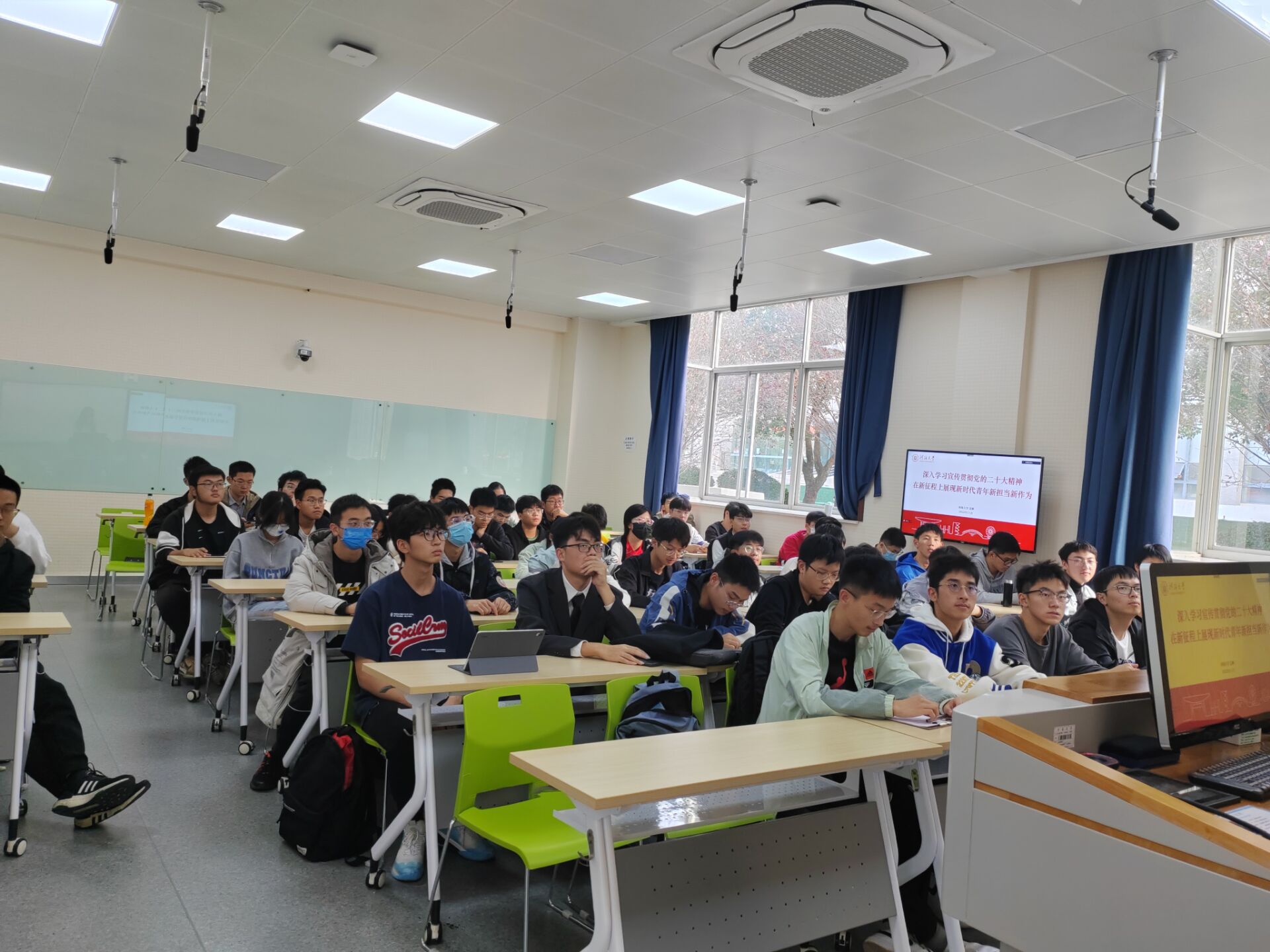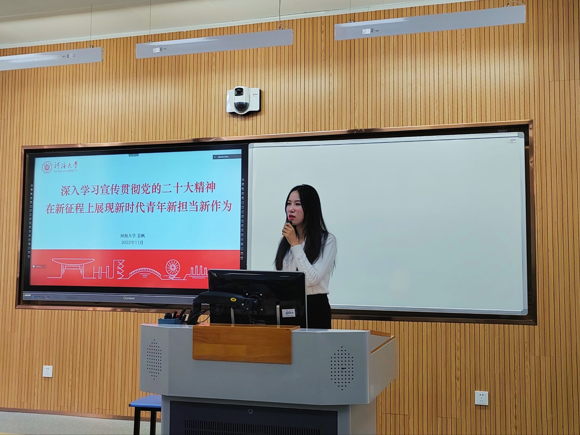 姜帆老师向大家介绍了中国共产党第二十次全国代表大会的基本情况,她就党的二十大主题的内涵做了深入阐释,从举什么旗、走什么路、坚持什么样的行动指南、传承什么样的精神法宝、以什么样的精神状态、朝着什么样的目标前进等几个问题出发,解读了二十大主题的精神内涵和深邃意蕴。她以从十八大以来河海大学在中国水利中做出的贡献为例,强调了高举中国特色社会主义伟大旗帜的重要意义。她从新时代10年的伟大变革出发,阐明了中国特色社会主义道路的重要性与必要性,强调了河海作为“红帽子大学”,始终坚守着爱国爱水的家国本色,矢志不渝的培养拥有家国情怀、河海特色的新时代水利人。