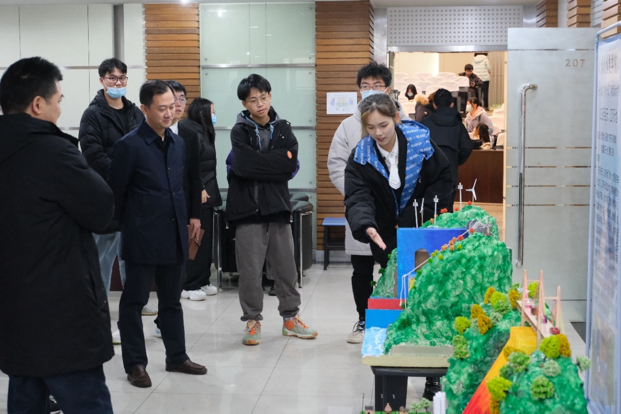 比赛之前,评委老师们近距离观察了选手们的精美作品,有以胡佛大坝和白鹤滩水电站为原型进行创新的“清水舞白鹤”坝;有关注生态保护,结合自然环境构建双鱼道的“龙门抱苍”坝;有依托党的二十大精神,结合科教兴国战略的“人民就是江山”坝;有大胆创新,结合智慧水利的“秋入云山”坝;有切合时代需求,兼顾泄洪、发电、旅游、生态的“源续千年”坝;有承载神话寓意、外观独特精美的“碧海青天”坝。