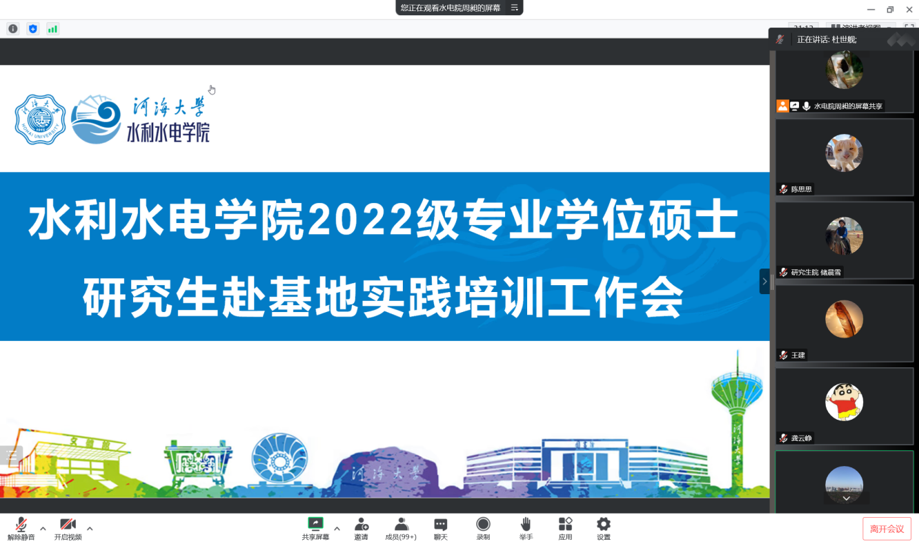 1月6日,皇冠赌场 召开2022级专业学位硕士研究生赴基地实践培训工作会。学校党委研究生工作部副部长、研究生基地管理办公室主任杜世舰,研究生基地管理办公室储晨雪,水电院副院长王建、党委副书记戴媛媛、教学秘书周昶、研究生辅导员陈思思及2022级全体专业硕士研究生在线上参加此次培训工作会。会议由王建副院长主持。