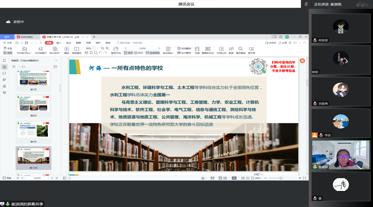 在海口市第一中学,实践团队在腾讯会议举行线上宣讲,为学弟学妹们的高考择校提供帮助。实践团成员提前演练,精心筹划,从校园文化、创新创业、学科特色、专业前景等多方面展现了河海大学的优势及特点,并向大家分享高考经验及大学生活,与同学们进行交流沟通、答疑解惑,为参会的同学们提供了优良的了解平台。本次宣讲激发了高三学子对大学生活的渴望与期待,也祝愿学弟学妹在新动力下不断前行,铸就辉煌!