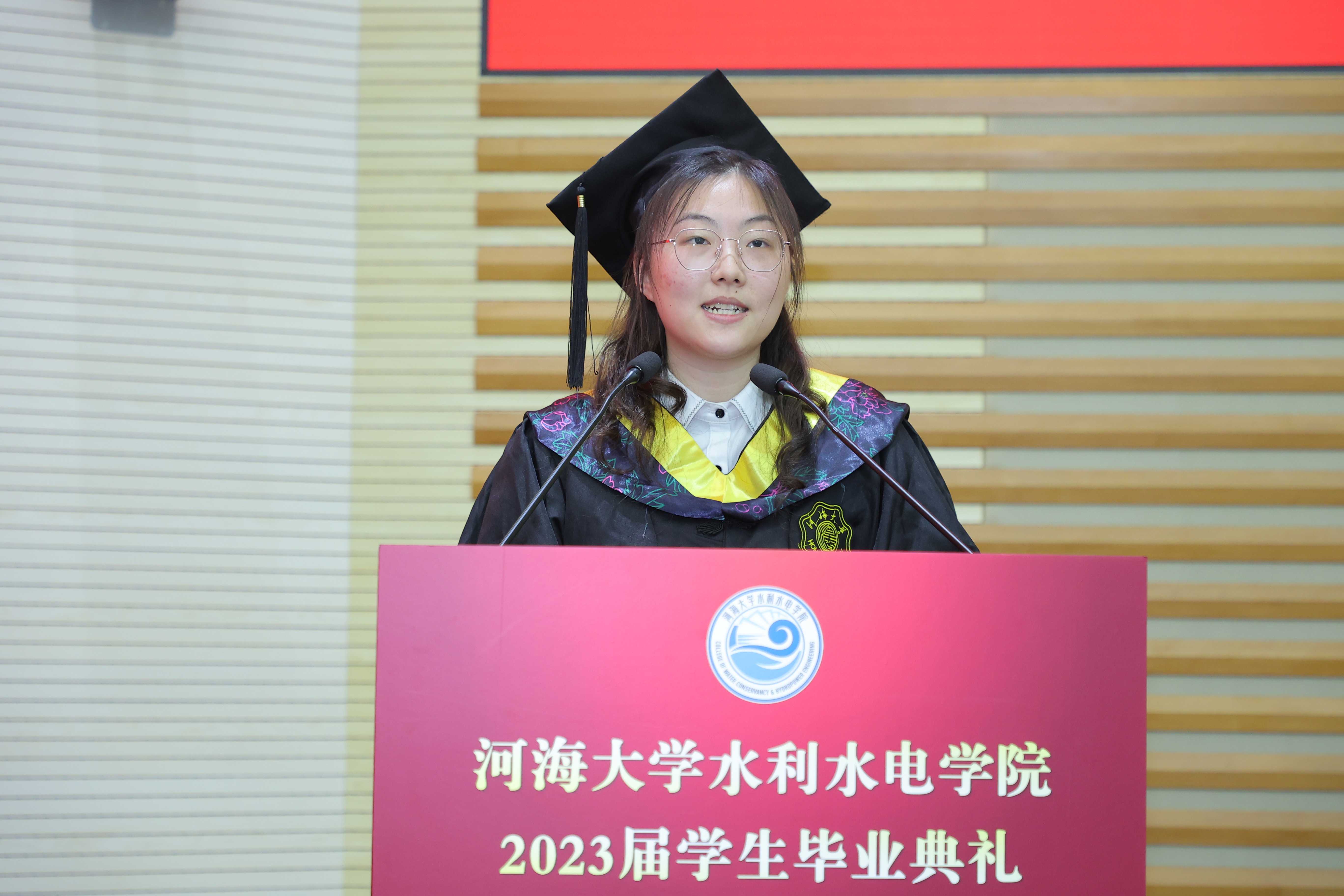 研究生毕业生代表黄啸宇、本科毕业生代表张亚琳发言,表达对于院深厚的感恩之情,展现了水电青年的志气与勇气。
