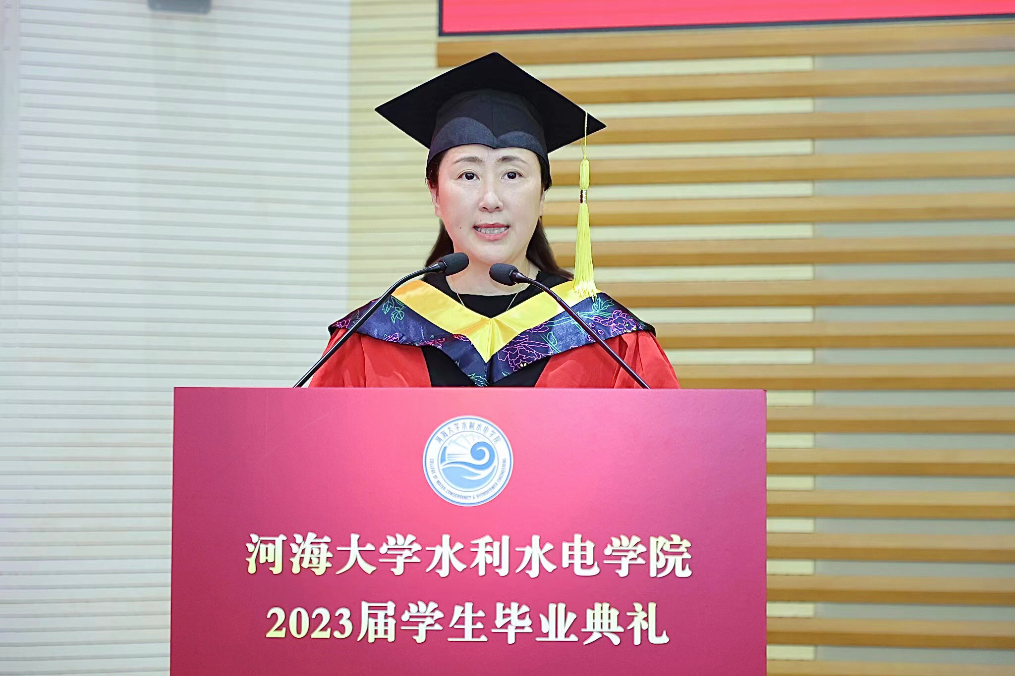 王媛发表致辞,她代表全院师生向顺利完成学业的全体毕业生们表示最热烈的祝贺,向辛勤付出的教职工老师以及学生家长们致以衷心的感谢。王媛对全体毕业生提出点期望:一是要心怀国之大者,坚定治水兴邦远大理想,传承河海人的家国情怀和使命担当二是守正创新,绽放熠熠生辉的水电光彩,坚守水利人的敢闯敢试的进取精神和职业操守。三是要饮水思源,赓续奋斗勇立时代潮头,描绘属于自己的水利蓝图。她希望,毕业生同学们要将新时代水利精神沁润心,在未来的人生路上勇做开路先锋和事业闯将,肩负起水电青年的时代使命秉河海之魂、承凌云之志、做擎天之柱、成济世之才,在民族复兴的征程中踔厉奋发、勇毅前行,投身到社会主义现代化建设的火热实践中去