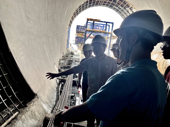 在丹江口大坝下游汉江右岸安乐河口,博士团跟随长江设计集团引调水院余义华主任和武松博士进入引江补汉工程出口段主体隧洞内调研,观察了输水隧洞钻爆法作业面衬砌支护施工过程,了解了隧洞开挖在面临强岩爆、突泥涌水、软岩大变形等问题时的具体处置方案。在桐木沟检修交通洞,博士团深入隧洞内近500m,进一步观察了沿线Ⅲ类和Ⅳ类围岩所采取的不同支护措施。之后博士团还观摩了引江补汉工程出口段数字孪生智能建造中心,学习了“智慧工地”、“数字孪生建设”的具体实践。
