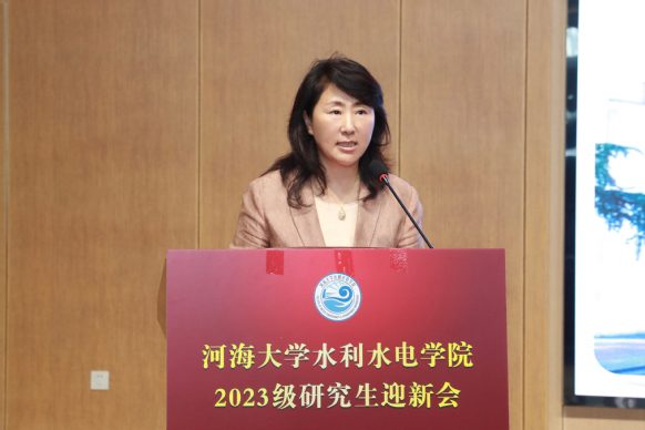 王媛院长代表全体师生员工向2023级新同学的到来表示热烈欢迎和衷心祝贺。她从学院历史、学科建设等方面介绍了皇冠赌场 丰硕的办学成果和雄厚的科研实力。她指出要心怀“国之大者”,勇立时代潮头,守护江河安澜,做信念坚定的研究者;要练就过硬本领,自觉担当重任,做脚踏实地的躬耕者;要牢记河海校训,坚持守正创新,做水利精神的传承者。她提到,要以实际行动践行新时代水利精神,成长为祖国和人民最需要的新时代水利人才。