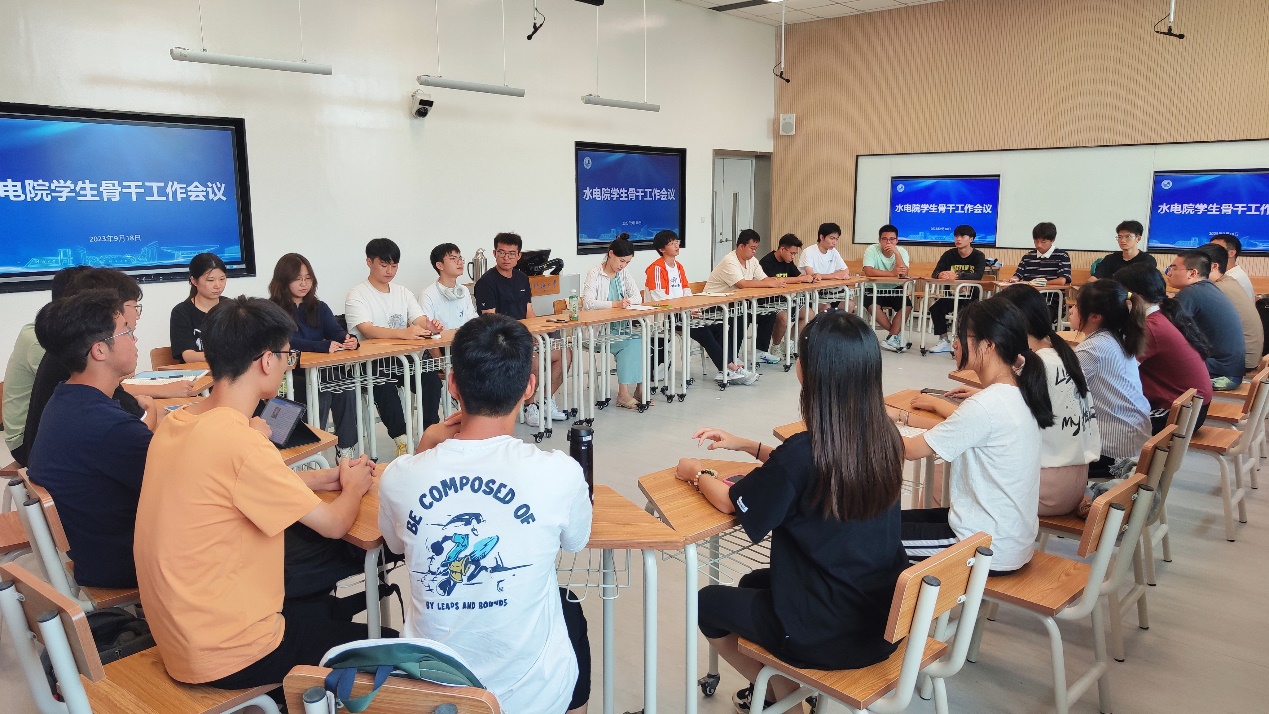 2023年9月18日,皇冠赌场 在金坛校区举办了2022级学生骨干新学年第一次工作会议,水电院2022级辅导员姜帆老师主持会议,2022级年级委、各班班长、团支书参加。
