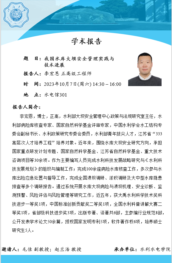 李宏恩,博士,正高,水利部大坝安全管理中心政策与法规研究室主任,水利部病险库核查专家、国家自然科学基金评审专家,中国水利学会水工结构专委会副秘书长、水利政策研究专委会委员,水利部青年拔尖人才,江苏省“333高层次人才培养工程”培养对象。近年来,围绕水库大坝安全研究方向,承担国家重点研发计划专题、国家自然科学基金、江苏省自然科学基金、重大技术咨询项目等30余项。作为主要编写人员完成水利科技发展战略研究与《水利科技发展规划》的组织与编制工作;完成100余座病险水库核查工作,多次参与水库出险应急处置与督导工作,完成全国溃坝调研、淤积调研及大中型水库隐患排查等多个调研报告。通过系统开展水库大坝病险与溃坝机理、安全诊断、监测预警、风险评估与风险管理等研究工作,近五年,获大禹水利科学技术奖科技进步一等奖1项,中国标准创新贡献奖二等奖1项,全国水利科普讲解大赛二等奖1项,省部级科技进步奖3项,出版专著、译著共6部,主参编行业规范8部,公开发表学术论文50余篇,授权国家发明专利5项,软件著作权6项,培养硕士研究生5人。