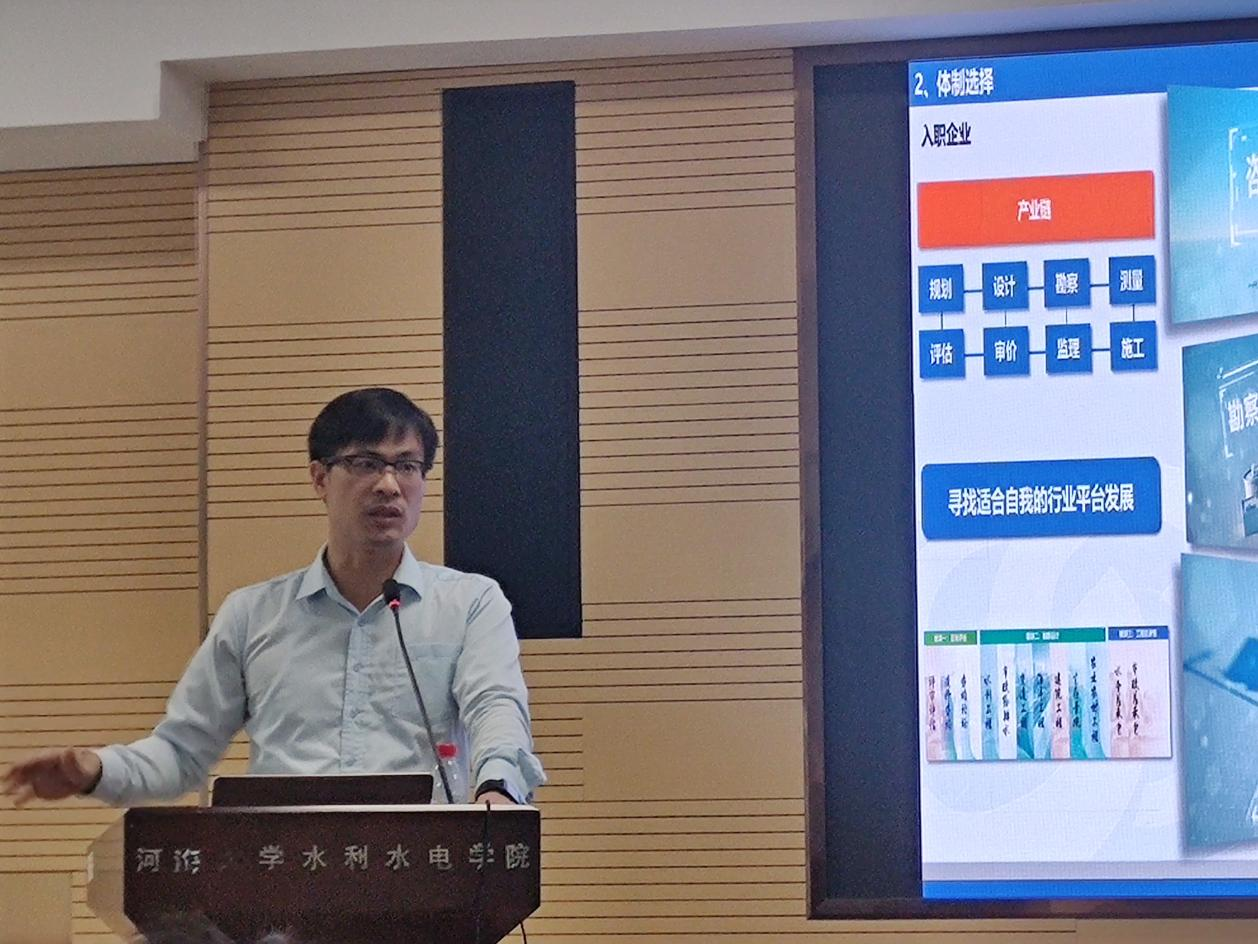 肖志乔从职业定位、目标定位、通道设计三个部分介绍了新时代皇冠赌场 职业规划。他鼓励同学们对职业规划感到迷茫时,可以从目标和定位出发,比如城市、体制选择等。是选择工资和生活水平更高但压力更大的一线城市,还是选择生活水平相对较低但压力适中的二线城市;是选择竞争压力较小但晋升途径较窄的单位,还是选择收入水平更高但行业竞争更为剧烈的企业单位,这些都会影响职业通道的设计。同时,分享中肖志乔为同学们介绍了数字孪生流域、抽水蓄能、极端天气水旱灾害防护等国家发展规划重点实施项目,希望帮助同学们进一步了解行业发展形势,从而更好做好职业规划。