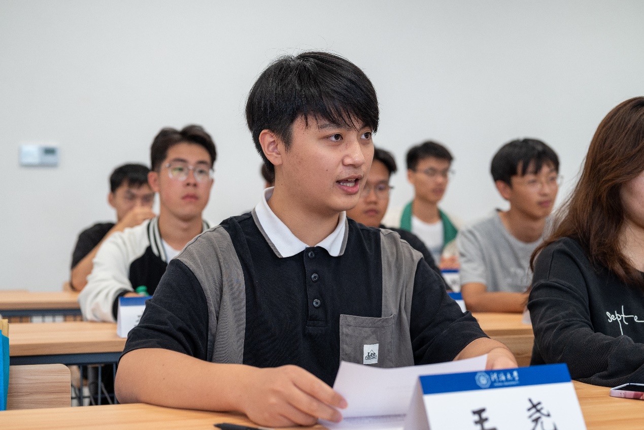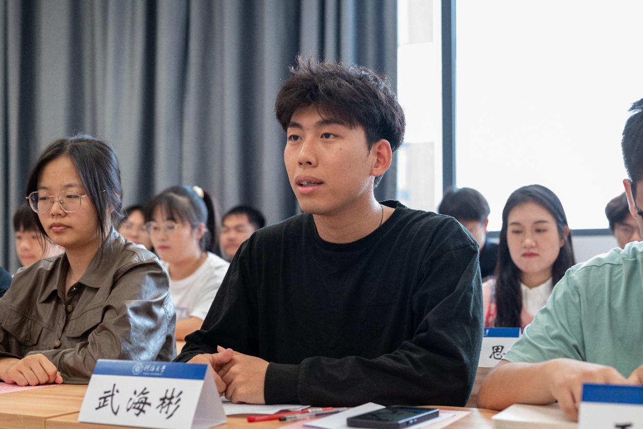 2023级硕士五班党支部书记武海彬作为硕士生学生骨干代表发言。他提到,在新校区、新环境、新形势下,硕士生与本科生应当进一步加强交流合作,以党员带动、组织带动、群体带动“三个带动”,本硕协同推进党团一体化发展。