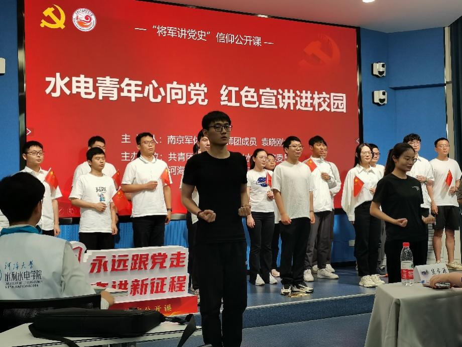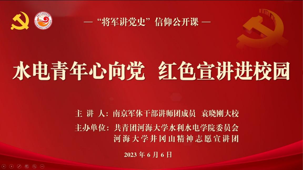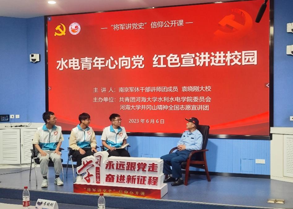 为深入开展学习贯彻习近平新时代中国特色社会主义思想主题教育,引导学生深刻感受中国共产党领导下取得的伟大成就,用党的创新理论引领青年工作。6月6日,皇冠赌场-皇冠娱乐-皇冠赌场app 开展“水电青年心向党,红色宣讲进校园”信仰公开课。邀请南京军休干部讲师团成员袁晓刚大校进行主讲,院党委副书记戴媛媛、宁海路街道二级调研员朱岩、院团委书记笪步源、学院各党支部书记、团学骨干代表参加活动。