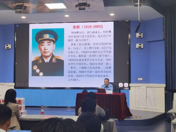袁晓刚老师声情并茂地讲述了父亲袁彬从放牛娃成长为新中国人民空军第一批飞行师长的革命斗争经历。讲座中,袁晓刚老师讲述了一个个激动人心、跌宕起伏的红色故事,我们跟随着故事一起重温了那个烽火连天的革命岁月,为革命先辈英勇无畏、不惧险阻的英雄气概所感染,敬仰之情油然而生。在以后的生活中也一定会铭记袁彬少校的“做人不畏千般险,做事不容半点虚”的教诲。