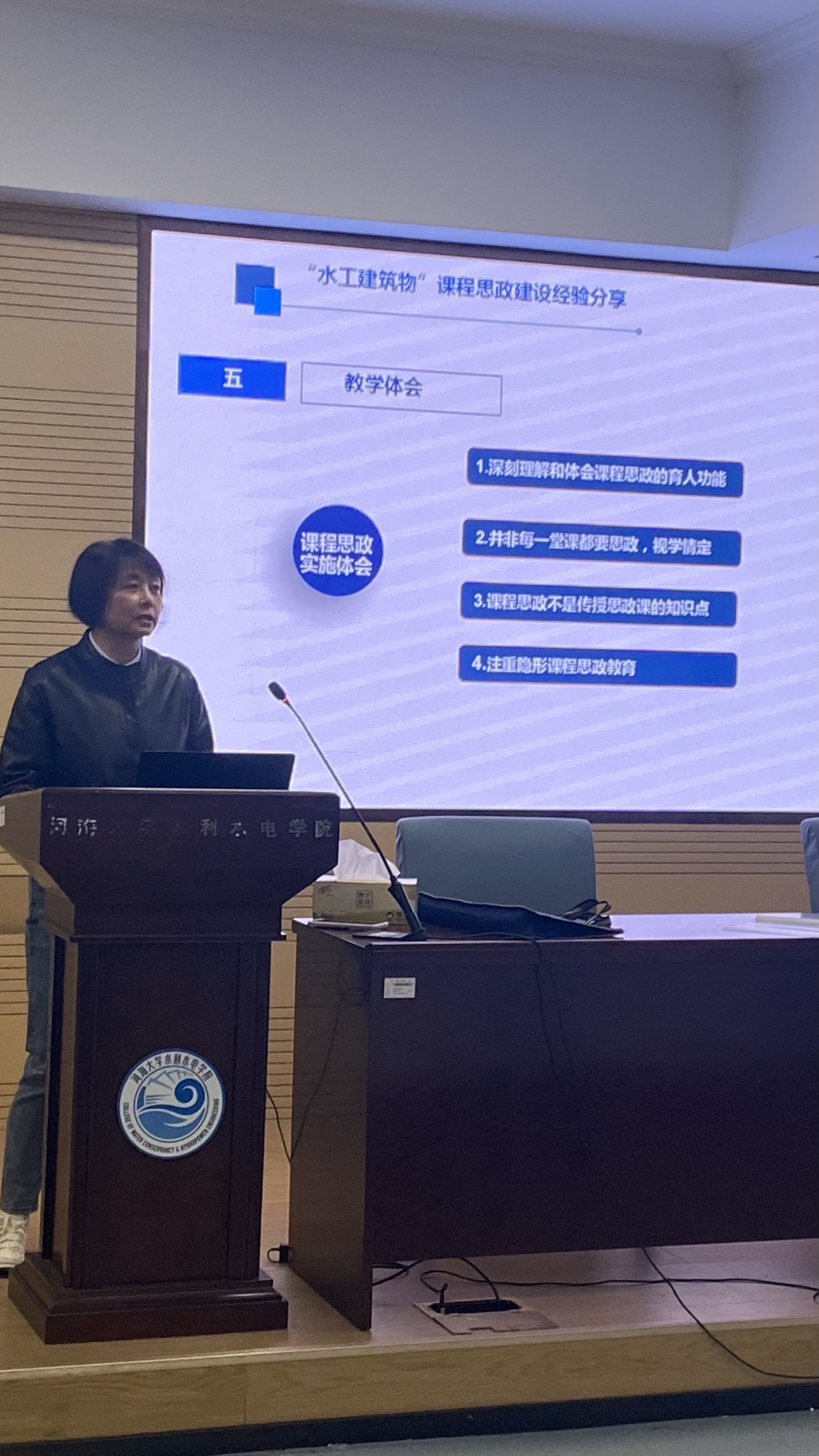 刘晓青教授负责的“水工建筑物”课程获2020年首批国家级线上线下混合式一流课程、2021年评为国家级课程思政示范课程,她从转变观念、内容优化、教学设计、教学评价和教学体会5个方面进行了生动的讲授,分享了“水工建筑物”课程思政建设的宝贵经验,由衷的感慨水利行业 “大工程”、“大家”为课程提供了丰富的思政元素,但思政元素需聚焦提炼,根据课程特点自成体系。最后她分享了对课程思政的思考和认识,她指出,每位老师都是行走的课程思政课堂,老师的一言一行对学生们影响深远,要不断提高自身的政治素养和职业素养。