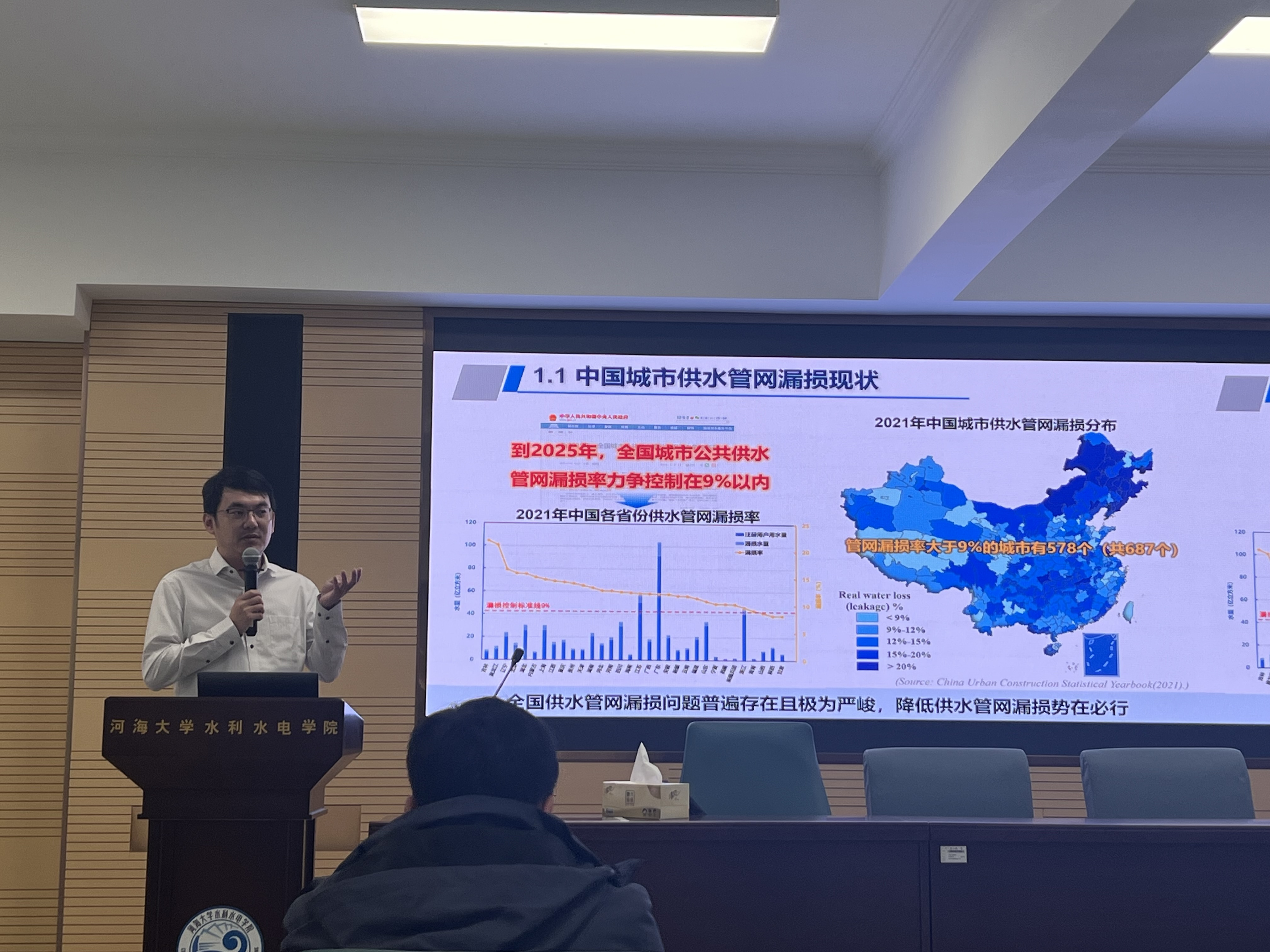 刘教授进行了题为“面向漏损问题的新型管网检测装备研究”的学术报告,系统介绍了其团队在城镇输配管网漏损检测装备研发方面的最新成果。报告中,刘教授分享了新型管网漏损检测技术与智慧水务的研究框架,强调了人工智能对水务行业科研范式转变的推动作用,并详细介绍了利用声、光、电、磁、热等技术对管网漏损进行检测的具体方法及相关自研产品,展望了未来漏损检测技术发展方向和难点突破。报告内容受到参会老师和同学们的热烈欢迎和讨论。