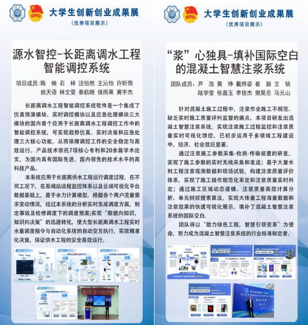 闭幕式上,皇冠赌场 展示了第七届水利设计创新大赛、第十七届“坝气十足”坝型设计大、第八届全国大学生水利创新设计大赛等赛事情况及部分获奖作品,展示了“互联网+”、“挑战杯”获奖项目《源水智控——长距离调水工程智能调控系统》、《“浆”心独具——填补国际空白的混泥土智慧注浆系统》等优秀创新创业成果。