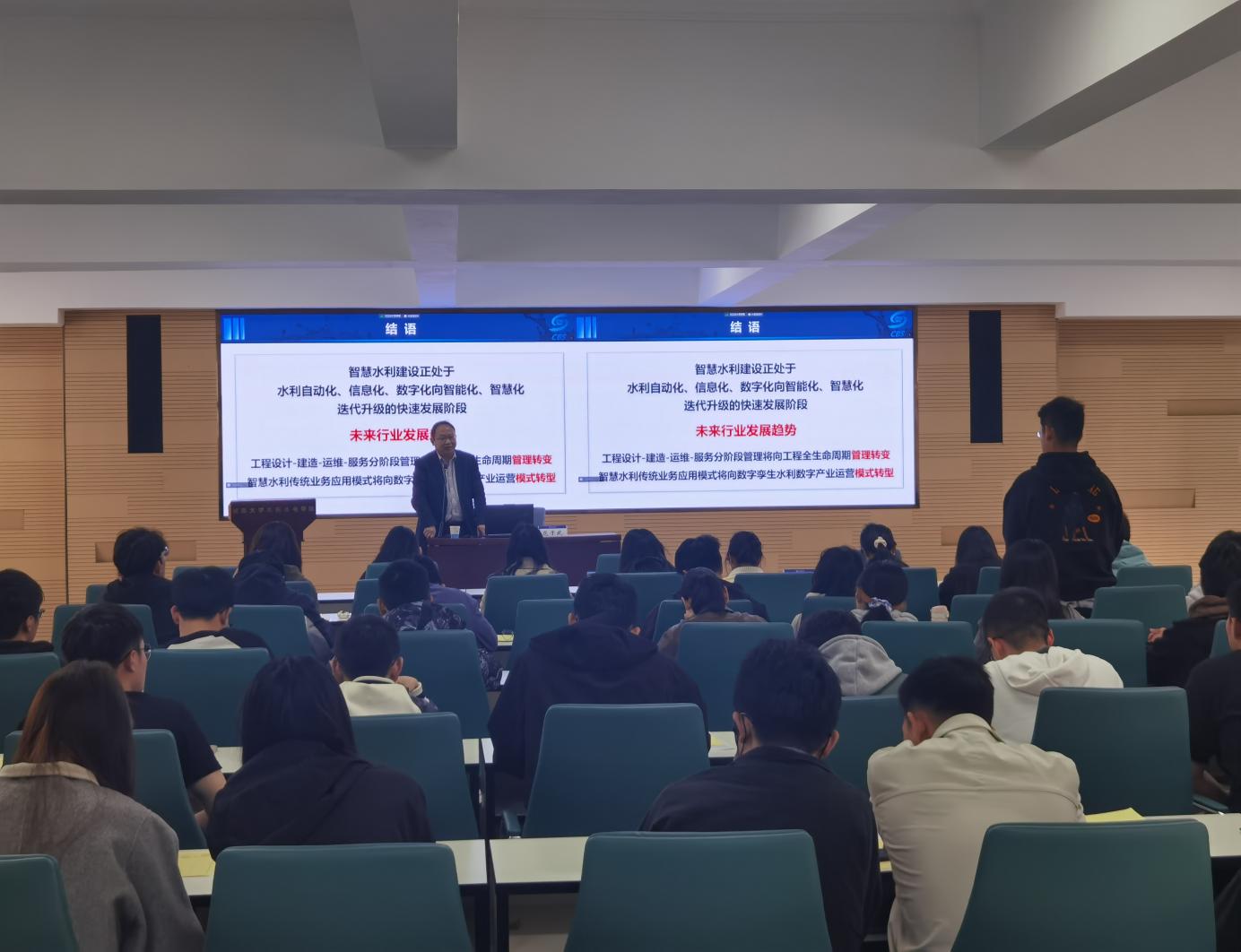 问答互动环节教授对同学们感兴趣的问题耐心给予解答,让大家对数字孪生水网构建有了更加深刻的认识和体会。范教授强调智慧水利建设正处于水利自动化、信息化、数字化向智能化、智慧化迭代升级的快速发展阶段,希望同学们能够紧跟时代步伐,继续深入学习数字孪生水网技术,也期待大家能够积极参与科研与实践,不断探索和创新,为水利事业的持续发展贡献力量。