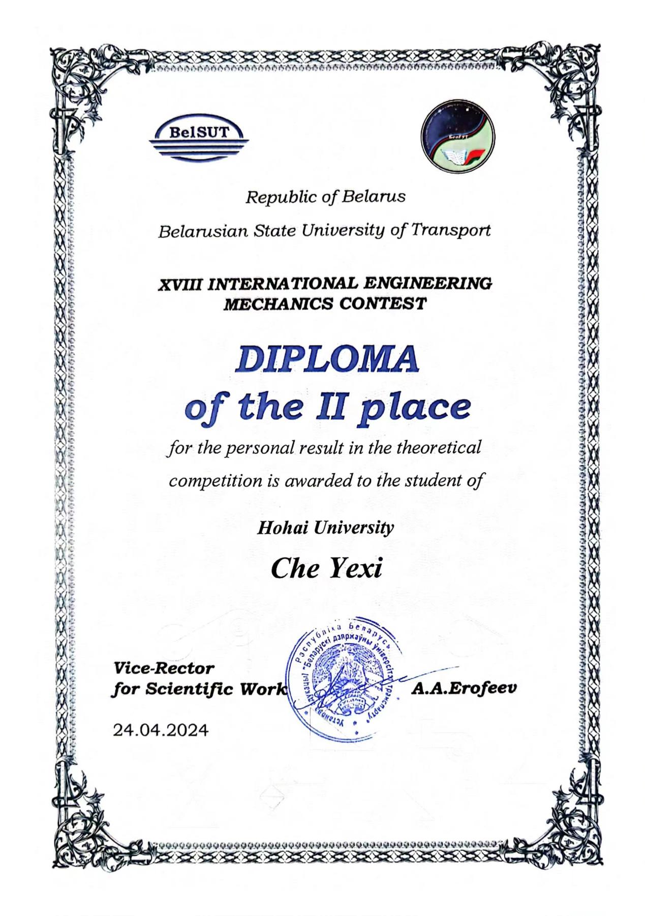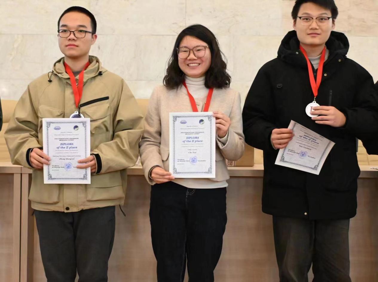 2021级本科生车烨晰同学参加了第十八届国际大学生工程力学竞赛,斩获个人赛银牌1枚。该赛事在白俄罗斯戈梅尔的白俄罗斯国立交通大学举行,来自中国、俄罗斯、白俄罗斯等多个国家共20余所高校100余位师生代表参加竞赛。据了解,去年12月车烨晰通过由我校主办的第四届国际大学生工程力学竞赛(亚洲赛区)选拔,获得参赛机会。