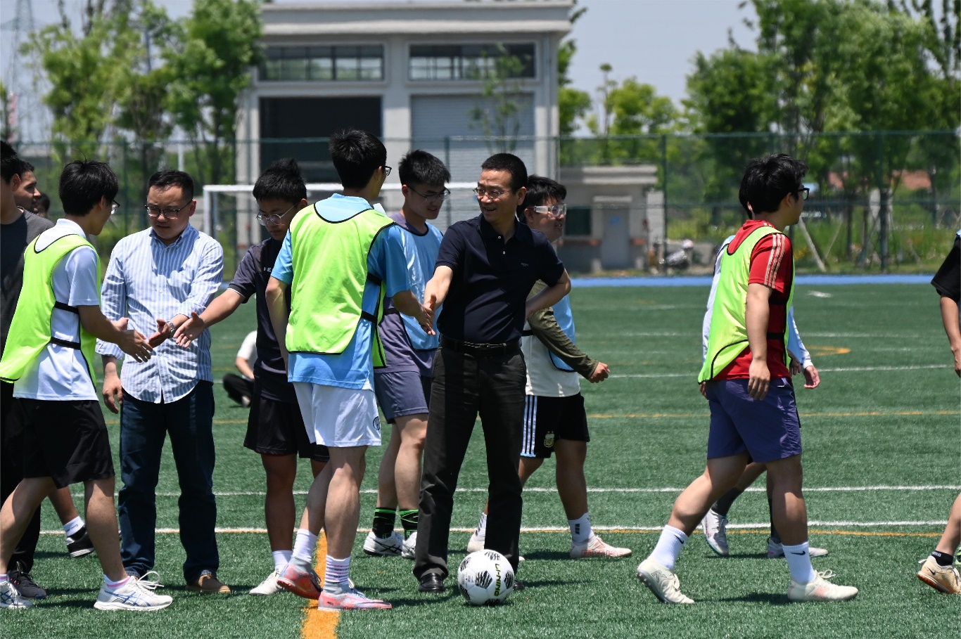 决赛于5月17日举行,由水工队对阵研究生队。皇冠赌场 党委书记娄健、副院长俞晓东、党委副书记戴媛媛、22级本科生辅导员姜帆受邀观赛。随着主裁判一声哨响,娄健书记在热烈的掌声中进行了开球仪式,为这场友谊赛注入了庄重与期待。