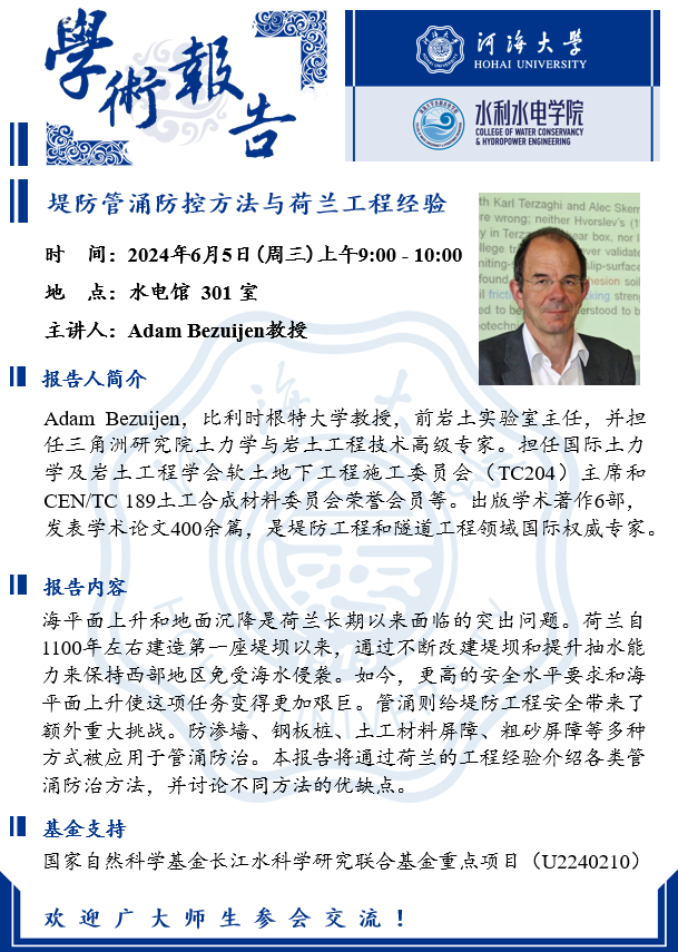 学术报告 | 堤防管涌防控方法与荷兰工程经验(报告人:Adam Bezuijen教授,比利时根特大学)