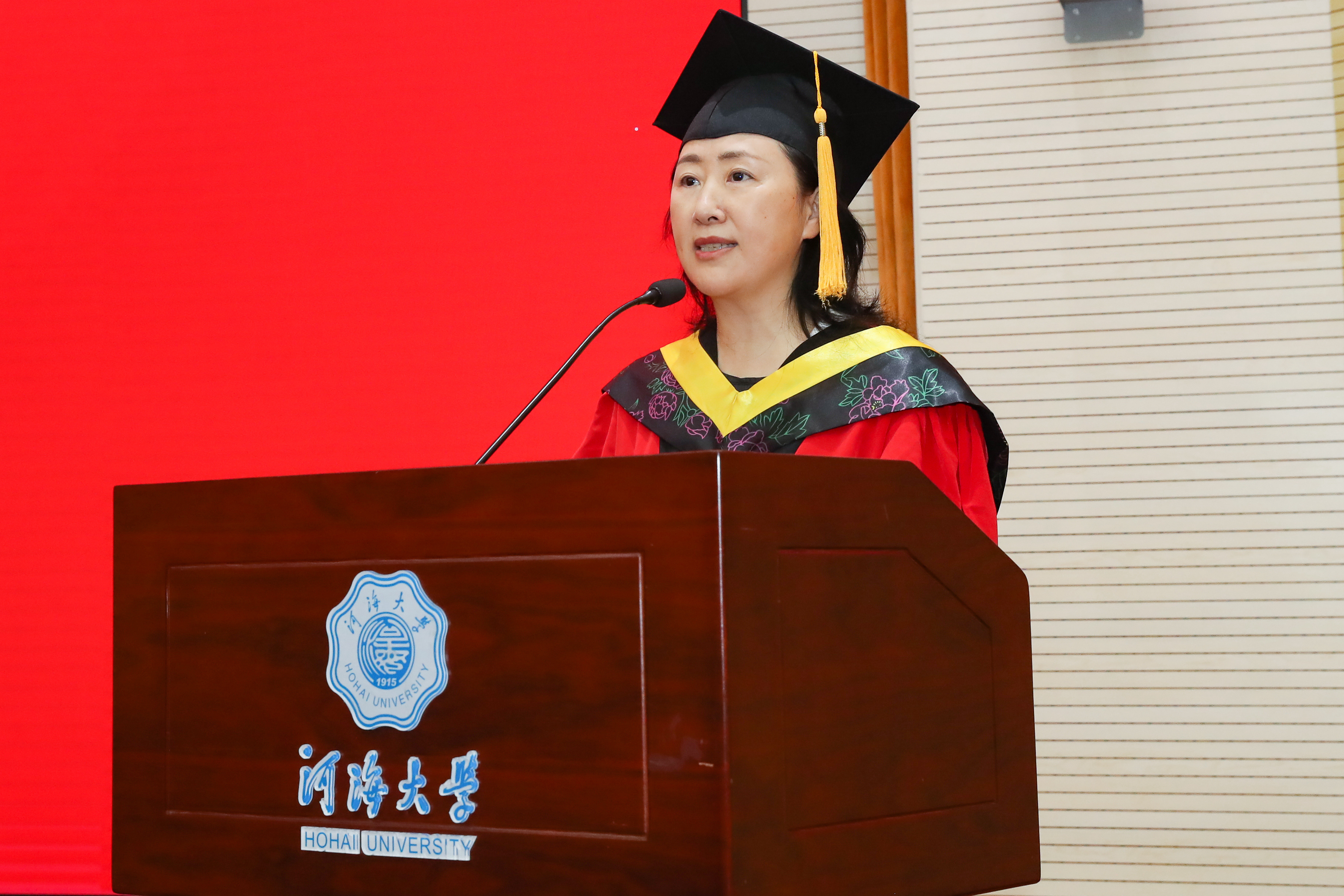 王媛发表致辞,她代表全院师生向顺利完成学业的全体毕业生们表示最热烈的祝贺,向辛苦劳作的教职工老师以及学生家长们致以由衷的感谢。王媛对全体毕业生提出三点期望:一是家国为先,坚守学水为善的初心使命,传承河海人的家国情怀和使命担当。二是矢志前行,绘制治水安澜的水利蓝图,成为担当水利强国大任的时代新人。三是笃行不怠,开创赓续发展的水利新篇,为祖国水利事业改革发展、中华民族伟大复兴贡献力量。她祝愿毕业生秉河海之魂乘风破浪,做擎天之柱建功立业,成济世之才强国兴国。