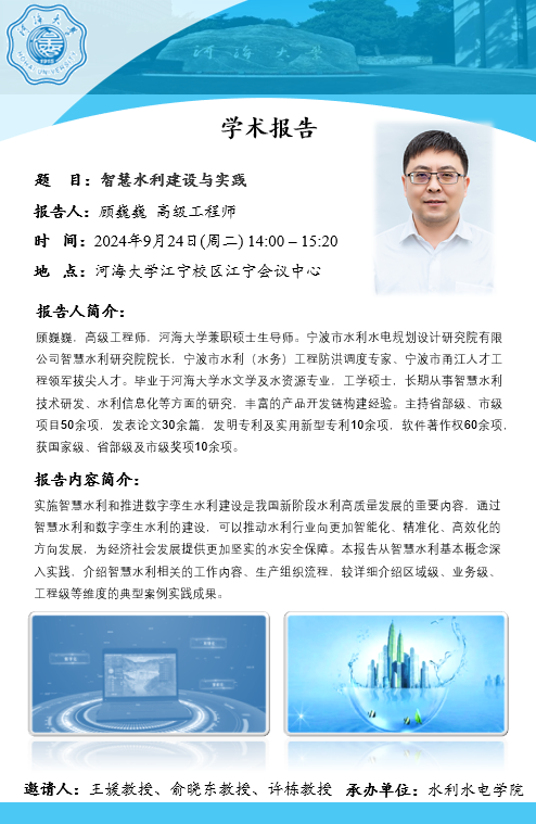 学术报告| 智慧水利建设与实践(报告人:顾巍巍,宁波市皇冠赌场 规划设计研究院有限公司)