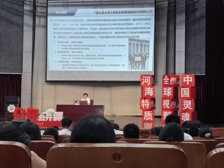 盛金保校友现任水利部大坝安全管理中心总工程师、南京水利科学研究院大坝安全与管理研究所所长,兼任河海大学教授,领衔团队荣获首届“国家卓越工程师团队荣誉称号。分享会上,盛教授以“学以致用,为水库大坝安全保驾护航”为主题,向新生们详细讲述了水库大坝在国家水安全和公共安全中的重要性,强调了保障大坝安全是水利学子的责任和使命。
