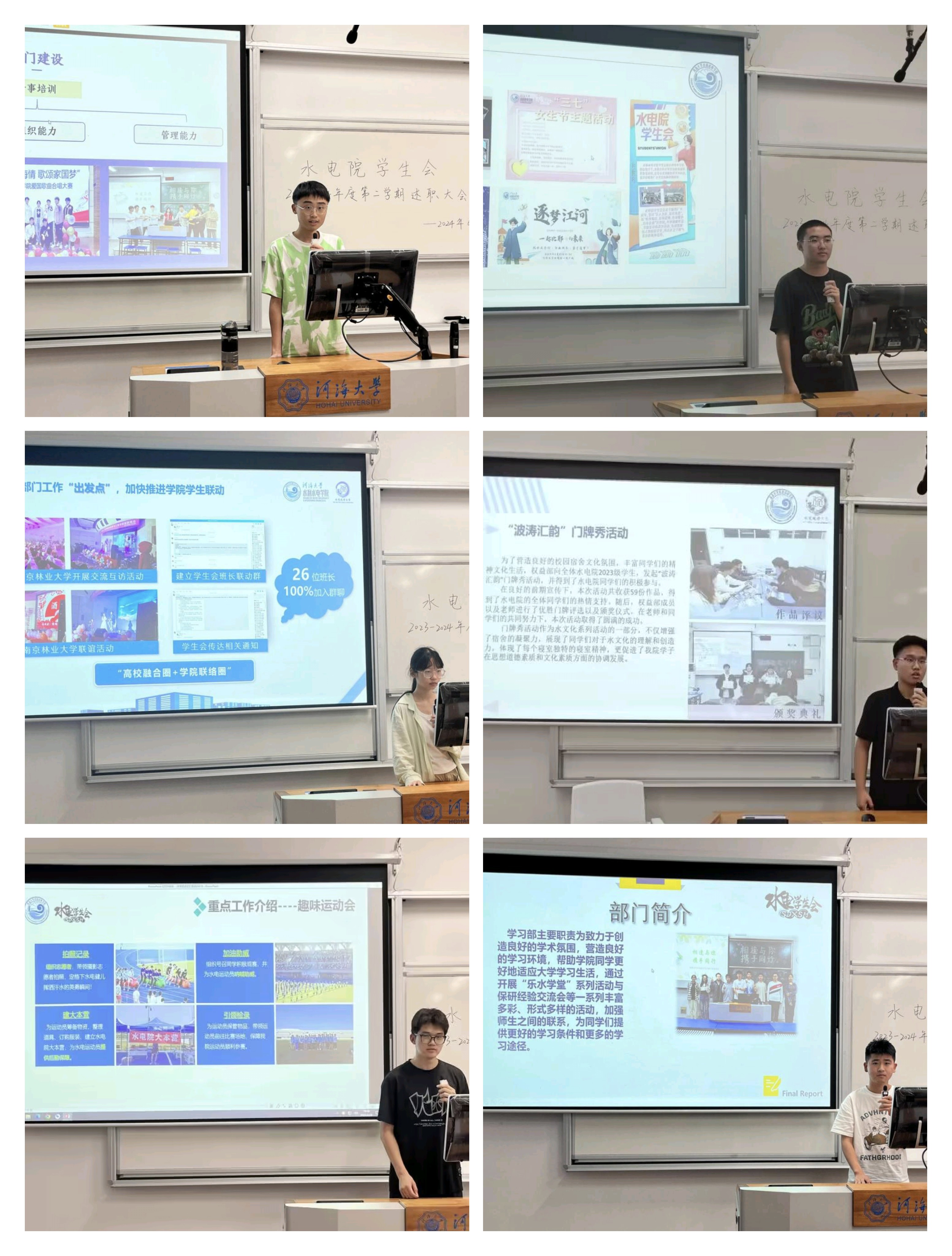首先由学生会各部门负责人进行述职。文艺部、文宣部、外联部、权益部、体育部、学习部的部门负责人依次作述职报告,以“水文化”系列活动、院体育文化节、乐水学堂、“新生杯”系列活动、“河海杯”系列比赛等学生会品牌活动为切入点,向老师和主席团汇报了各部门活动开展上的具体成效,总结了所在部门的不足之处,提出了部门未来的工作展望。