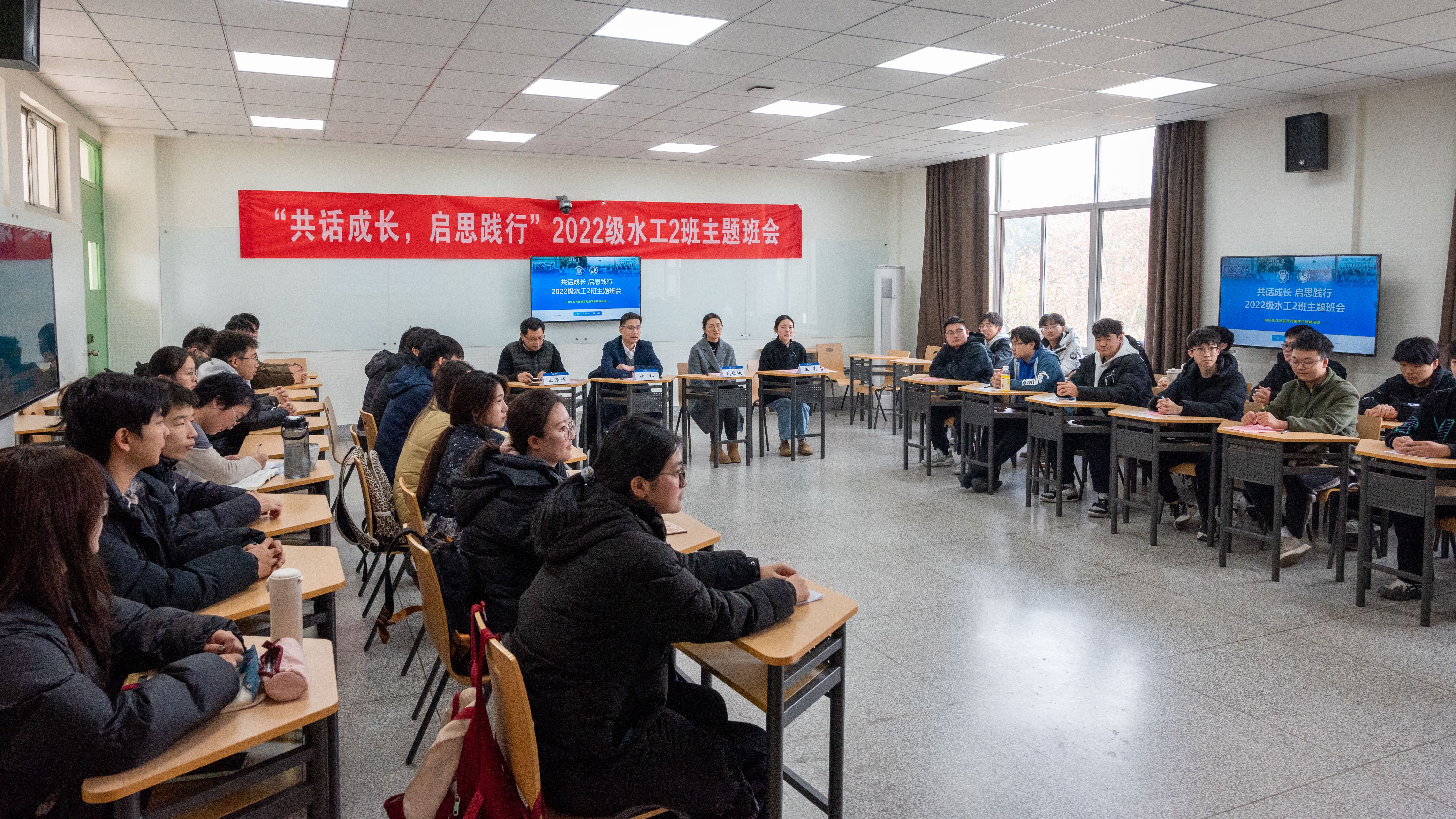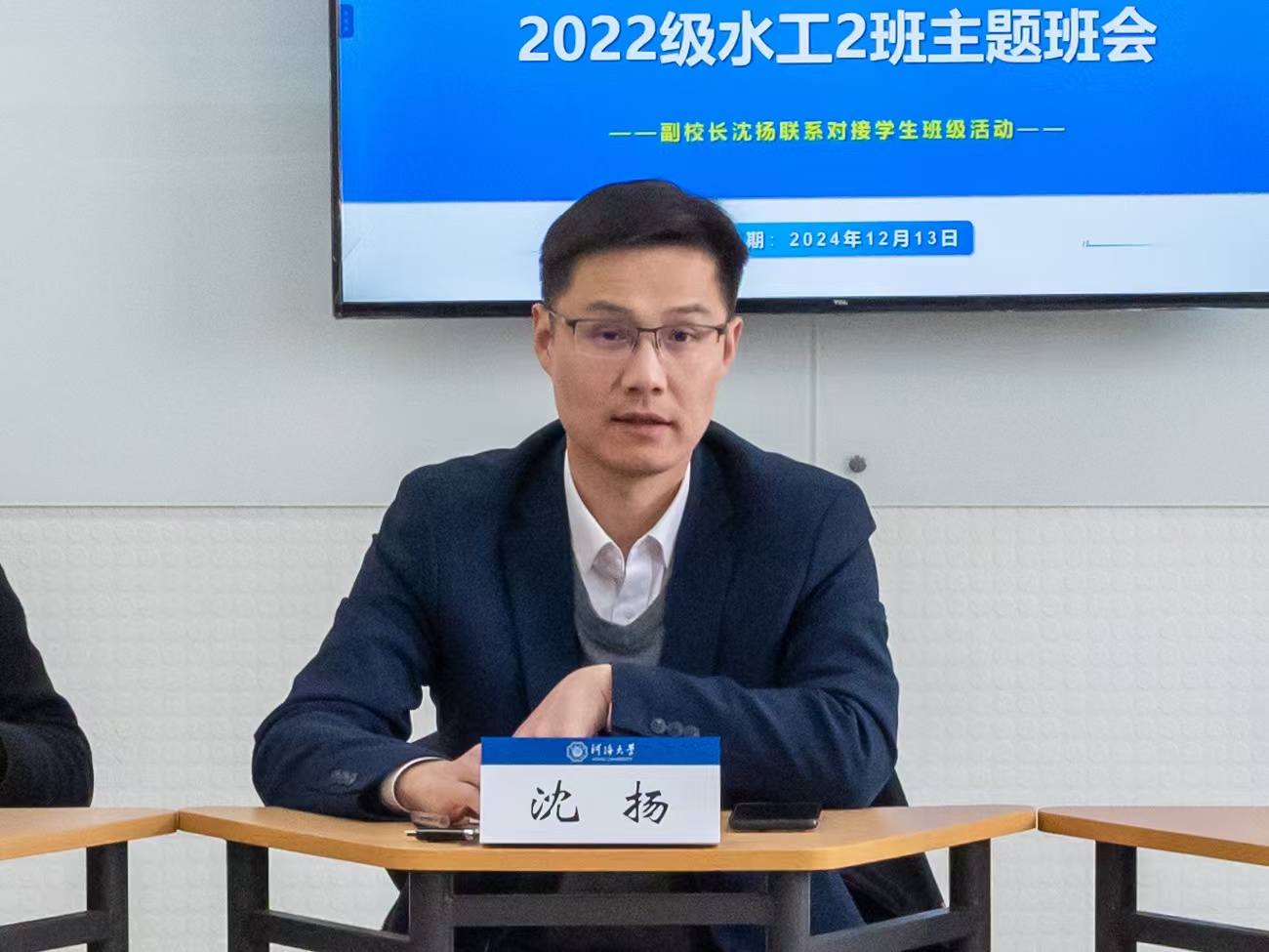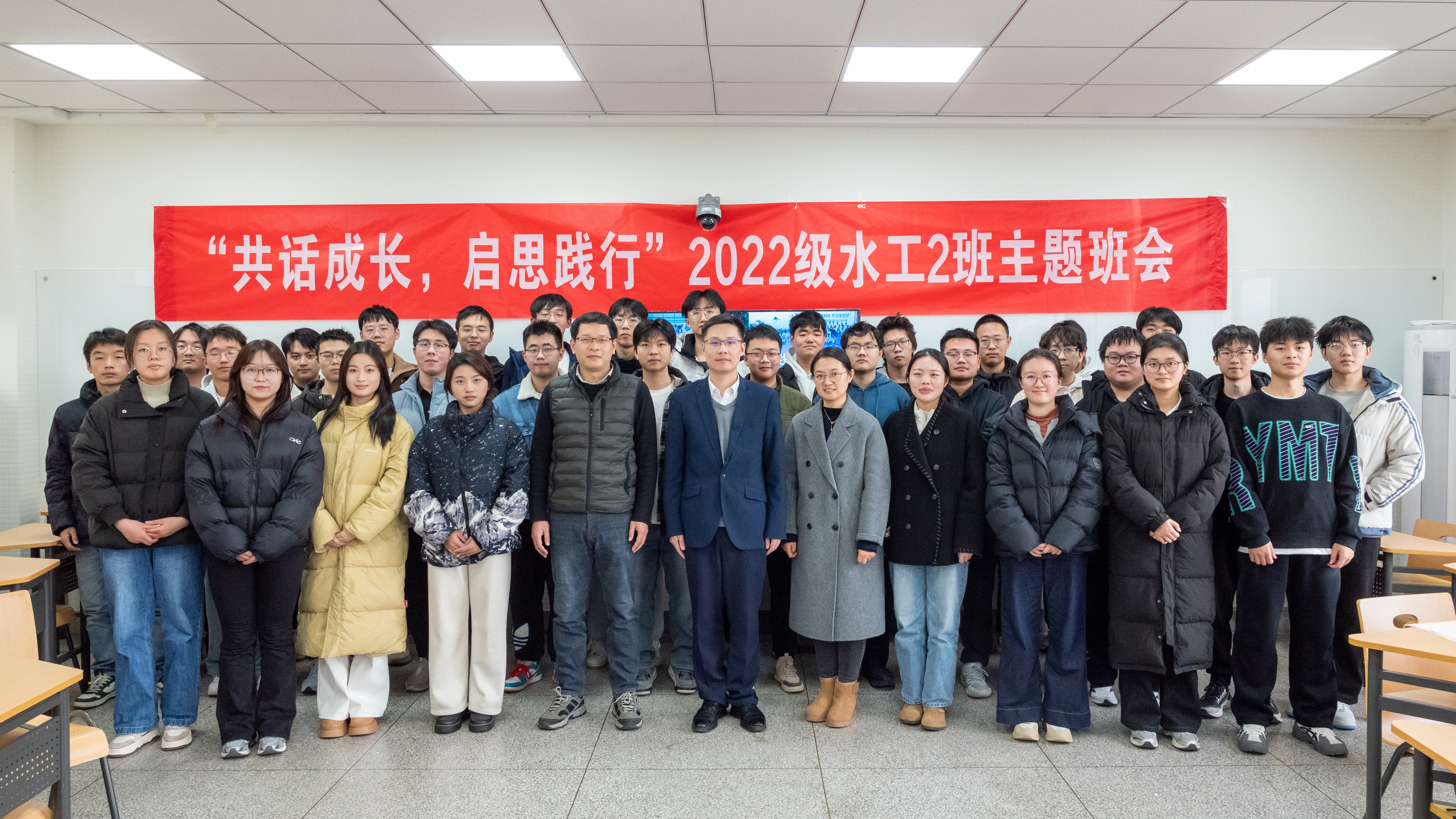 沈扬副校长听取了班级建设情况的汇报,对水工2班建设成果和同学们成长发展取得的成绩给予充分肯定。他对同学们提出三点期望:一是志存高远,与时代同步伐、与人民共命运,将个人的成长与国家发展需要、行业发展需求紧密联系,厚植报国情怀、勇担时代使命;二是溯求真知,利用学校提供的丰富资源,不断丰富知识学习,培养创新精神与实践能力,实现学习科研道路上新的突破;三是凝聚力量,加强同学、师生、年级之间交流,推动两地三校区工作协同,促进朋辈学习成长、班级建设成效经验的传承。