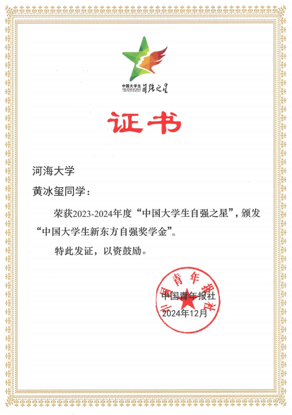 近日,由共青团中央、全国学联指导,团中央基层建设部、中国青年报社主办的“中国大学生自强之星”评选活动落下帷幕,皇冠赌场 水力学及河流动力学专业2024级博士生黄冰玺荣获“中国大学生自强之星”荣誉称号。