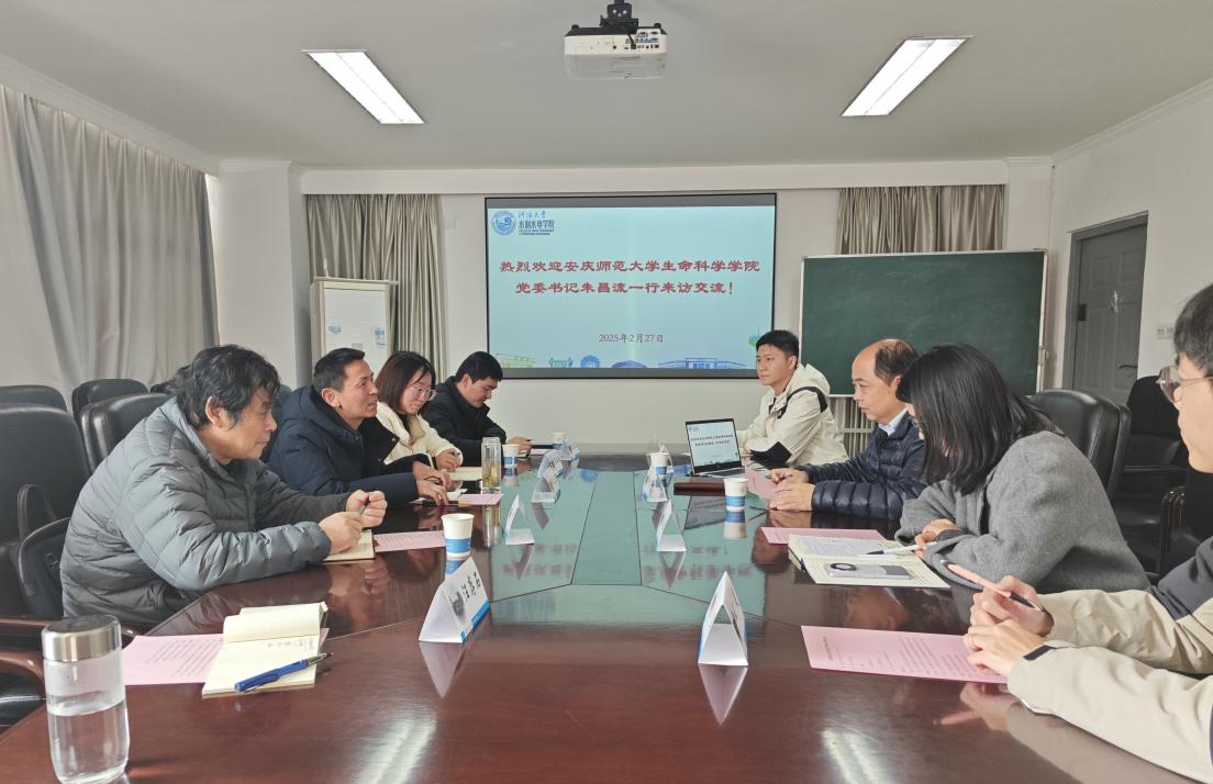 2月27日下午,安庆师范大学生命科学学院党委书记朱昌流一行来皇冠赌场 座谈交流。水生生物保护与水生态修复安徽省高等学校工程技术研究中心主任于道平及其团队成员陈敏敏、连玉喜、汪存石,学院副院长冉启华、副院长俞晓东,院党委副书记戴媛媛,水力学及河流动力学所教师惠辞章,研究生辅导员陈思思以及水力学及河流动力专业博士研究生王昊参加了本次座谈会。