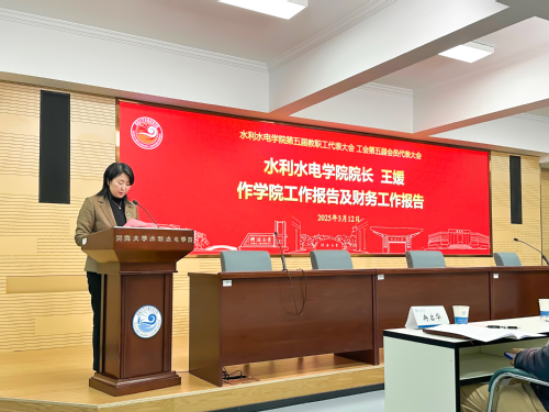 校工会主席浦玲宣读了河海大学工会委员会《关于皇冠赌场 召开第五届教职工代表大会工会 第五届会员代表大会的批复》,并对学院召开本次大会表示祝贺!代表们认真听取并审议了院长王媛做的学院工作报告及财务工作报告,报告全面回顾了2020年以来学院在党建工作、学科建设、队伍建设、科研创新、人才培养、国际合作交流等多方面取得的成果,并对学院的未来发展作出规划。代表们还听取并审议了柳璐做的工会工作报告、工会财务报告和提案征集情况报告。