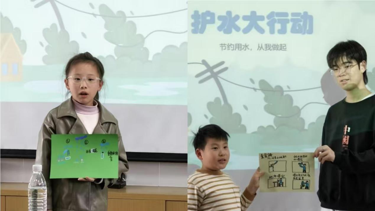 在“护水大行动”互动实践环节,小朋友们被分成四组,抽取不同的地点卡片,如学校、家庭、公园和其他,大家发挥丰富的想象力,讨论并绘制出在该特定场景下的节水方法,并向全体参与者介绍自己小组的创意。这个环节不仅激发了孩子们的创造力,还让他们深刻理解了节水在不同场景下的具体实践。