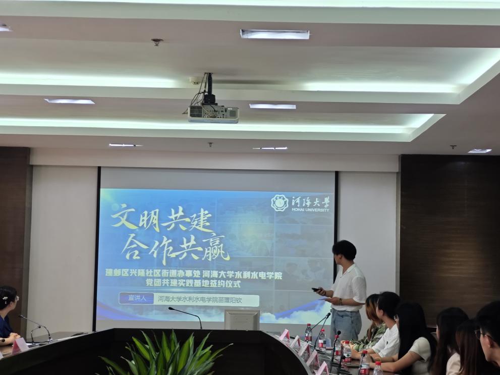 签约仪式以“合作共建党团共建实践基地”为主题,建邺区兴隆街道副主任孙如凤、皇冠赌场-皇冠娱乐-皇冠赌场app 团委书记笪步源等双方代表出席。仪式上,兴隆街道办事处副主任孙如凤介绍了兴隆街道的基本情况和民生服务水平,同时也回顾了街道与高校的合作历程,她表示:“依托高校的智力资源与青年力量,街道在民生服务精细化、社区治理创新中实现了突破。”皇冠赌场-皇冠娱乐-皇冠赌场app 团委书记、本科生第三党支部笪步源介绍了河海大学以及皇冠赌场 的基本情况,结合党建引领、团建赋能、水利特色的品牌项目,就此次校地合作交流提出新的想法和思考。她强调:“基地共建是深化产教融合的重要载体,学院团委和本科生第三党支部将以专业优势赋能基层发展,培养兼具理论素养与实践能力的青年人才。”