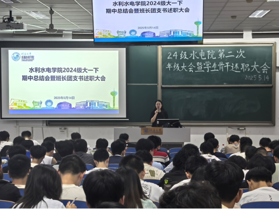 为进一步加强学风建设,营造积极向上的学习氛围,皇冠赌场 于5月14日召开2024级期中总结会暨班长团支书述职大会。会议由2024级辅导员笪步源主持,全体2024级学生参加。