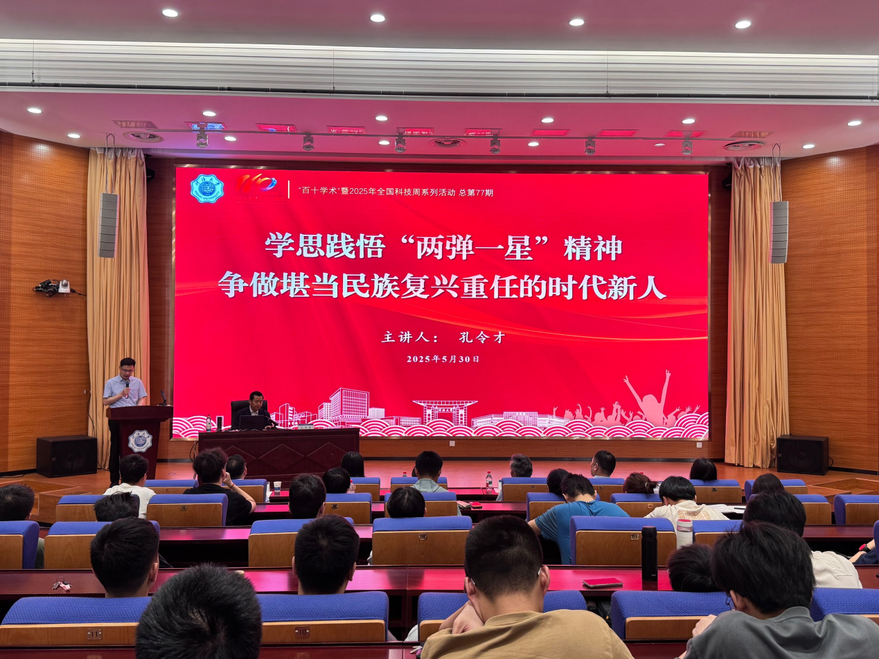 530日,皇冠赌场 举办“百十学术”校庆系列活动总第77期暨2025年全国科技周系列活动。马兰基地原政委、“两弹一星”历史研究会常务副理事长、全国高校“中国共产党人精神谱系”宣讲团成员、中国科学家精神宣讲团成员孔令才将军应邀担任主讲嘉宾,为我校师生作题为《学思践悟“两弹一星”精神,争做堪当民族复兴重任的时代新人》的专题报告,活动由河海大学副校长沈扬主持,学院院长王媛、副院长俞晓东、党委副书记戴媛媛、教师和学生代表共计150余人参加。