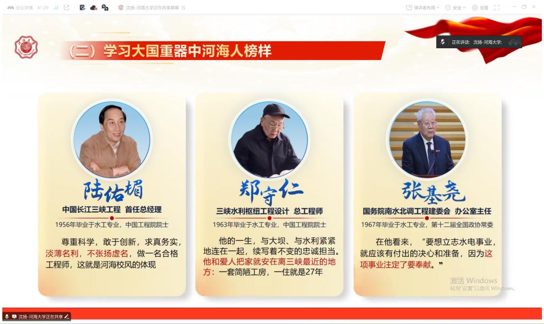 沈校长结合河海大学110周年校庆,以学校先辈为例,强调传承优良作风的重要性,对学生党员提出殷切期望。希望同学们在日常学习生活中对标中央八项规定精神,查摆不足,杜绝学业上的“躺平”、生活中的铺张、评奖评优中的弄虚作假、学生工作中官僚主义倾向、党员身份意识淡薄等问题。并以水电先辈陆佑楣、郑守仁、张基尧院士为例,寄语支部党员和2022级水工二班学子牢记校训精神,心怀国之大者,将个人理想融入时代洪流,坚守信念锤炼能力,涵养品德勇担使命,为中国式现代化发展贡献水电学子的智慧和力量。