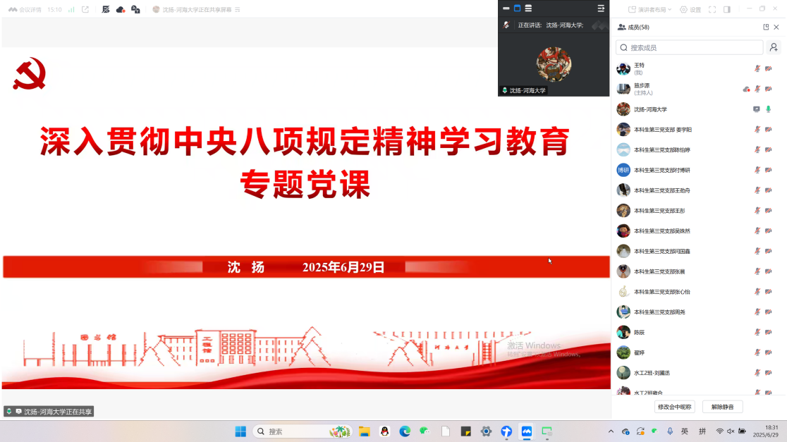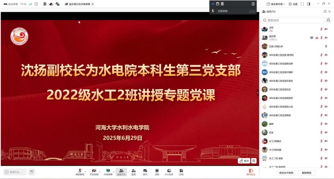 为深入贯彻中央八项规定精神学习教育,6月29日,河海大学副校长沈扬为对接联系的皇冠赌场 党支部和班级讲授专题党课。学院党委副书记戴媛媛、党政办翟婷、班导师王伟强、团委书记笪步源、2022级本科生辅导员陈辰及本科生第三党支部、2022级水工二班全体成员参与学习,活动由戴媛媛主持。
