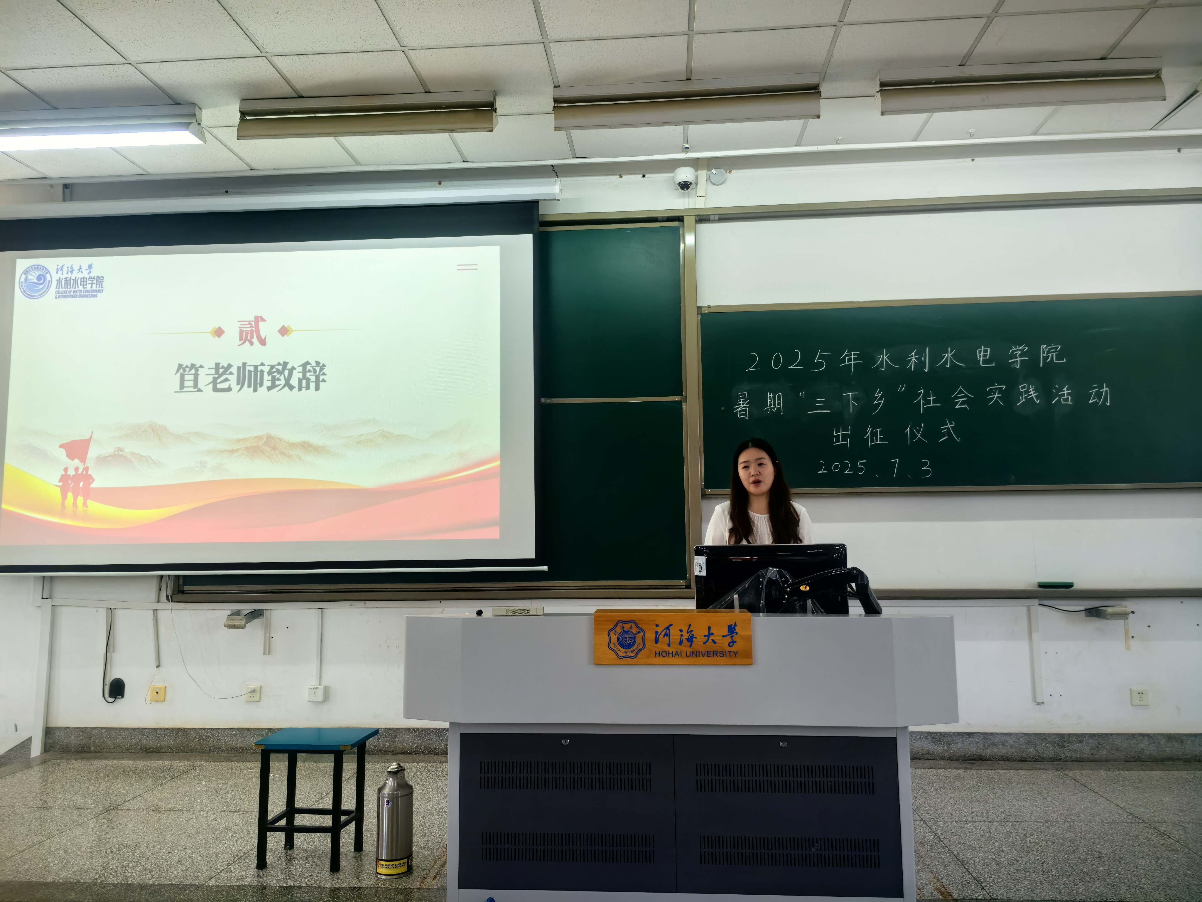 优秀团队代表成昊泽讲述了自己对本次 “三下乡“暑期实践活动的理解与感受:本次实践不仅是一次锻炼自我的机会,更是传承和弘扬河海水电精神的契机。实践活动应紧密结合水利特色,以实际行动为河海大学110周年校庆献礼,并号召团队成员在实践中互帮互助,培养合作能力与创新精神,展现河海水电学子风采。