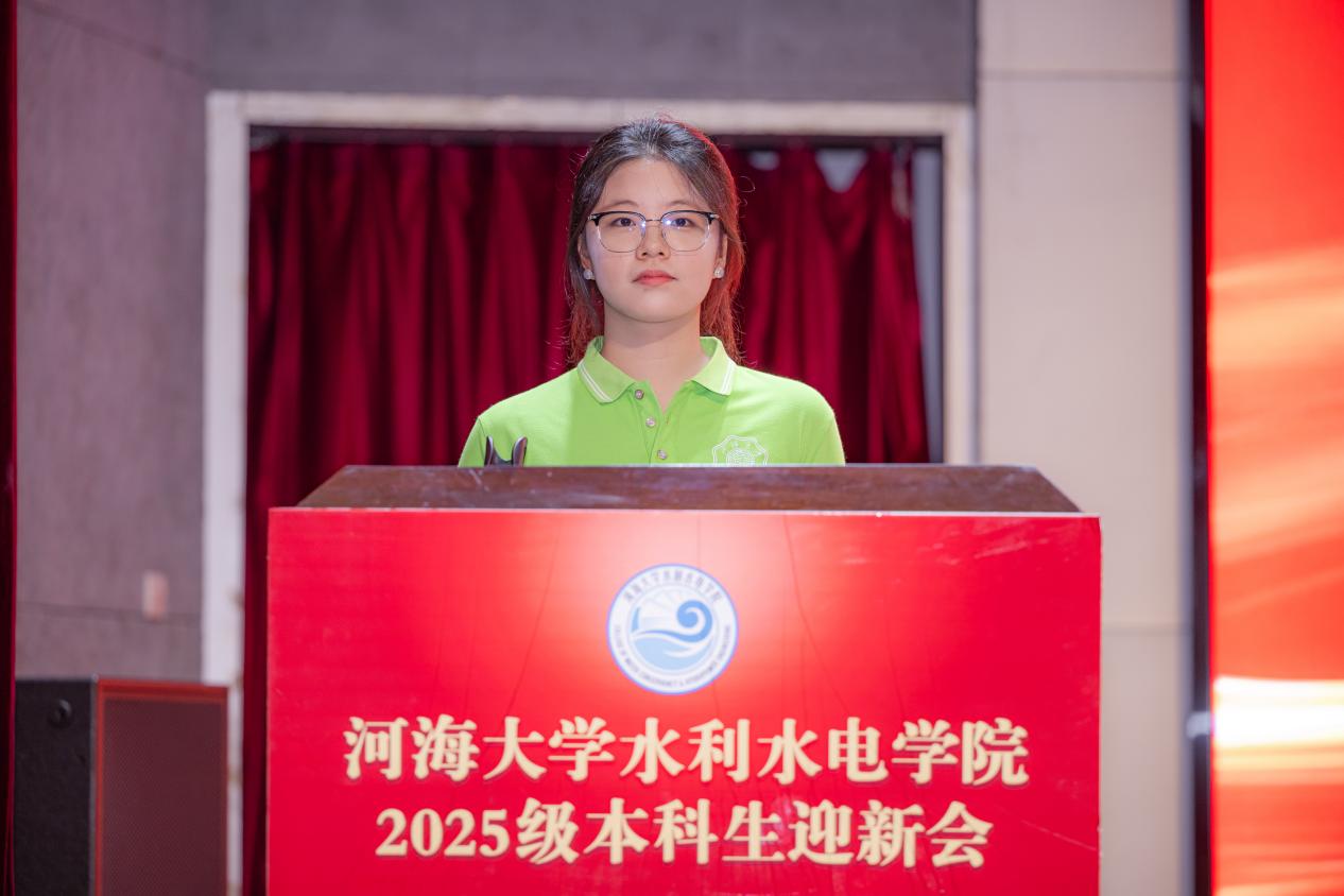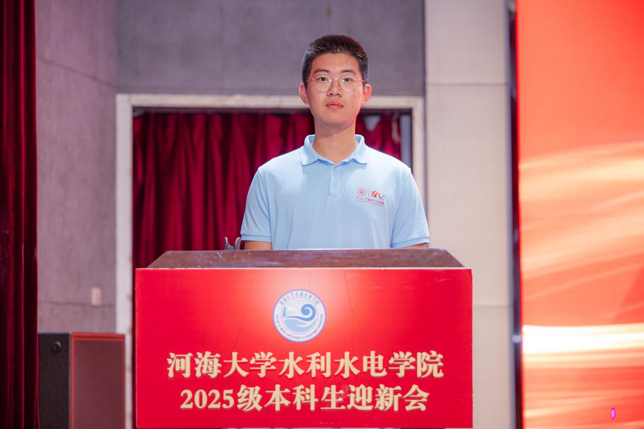 新生代表2025级皇冠赌场 工程专业李彦德同学代表全体新生发言,讲述了自己选择河海的历程,围绕大学规划,表达了对未来校园生活的展望。作为建校110周年之际的新生,他表示将与师生共同努力,为河海大学再谱新章。