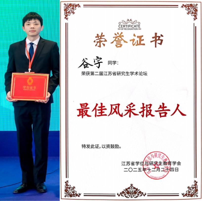 12月24日,第二届江苏省研究生学术论坛在南京成功举办。本届论坛在江苏省教育厅的指导下,由江苏省学位与研究生教育学会主办、南京邮电大学承办,引进了国际学术界通用的“三分钟论文演讲”(3MT)展示模式,强调在极短时间内清晰、生动地阐述科研工作的价值与发现,突出跨学科融合、科研普及与表达能力并重的指导思想。本届论坛由江苏省教育厅原厅长葛道凯、南京邮电大学副校长谢平等多位资深专家担任评委,皇冠赌场 谷宇同学代表学校参加论坛并获评“最佳风采报告人”和“优秀学术报告”奖,江苏省教育厅原厅长葛道凯为谷宇同学颁发奖项。
